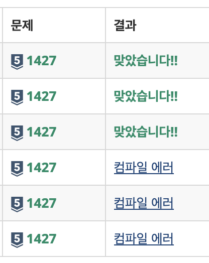 - 처음에는 그동안 입력 받은 것을 쪼개듯이 split을 사용했는데 컴파일 에러가 났다.