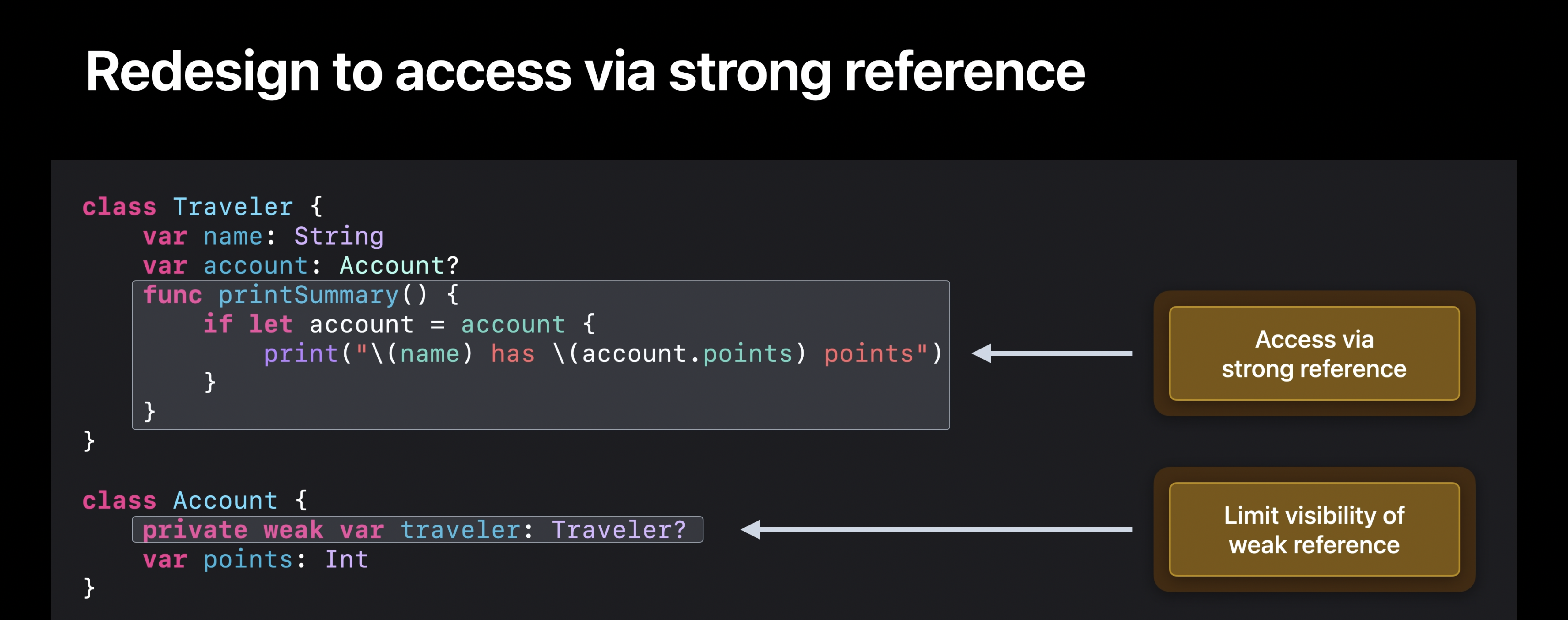 - 위 예시에서는 Account 클래스의 traveler 참조를 weak으로 표시하였음
