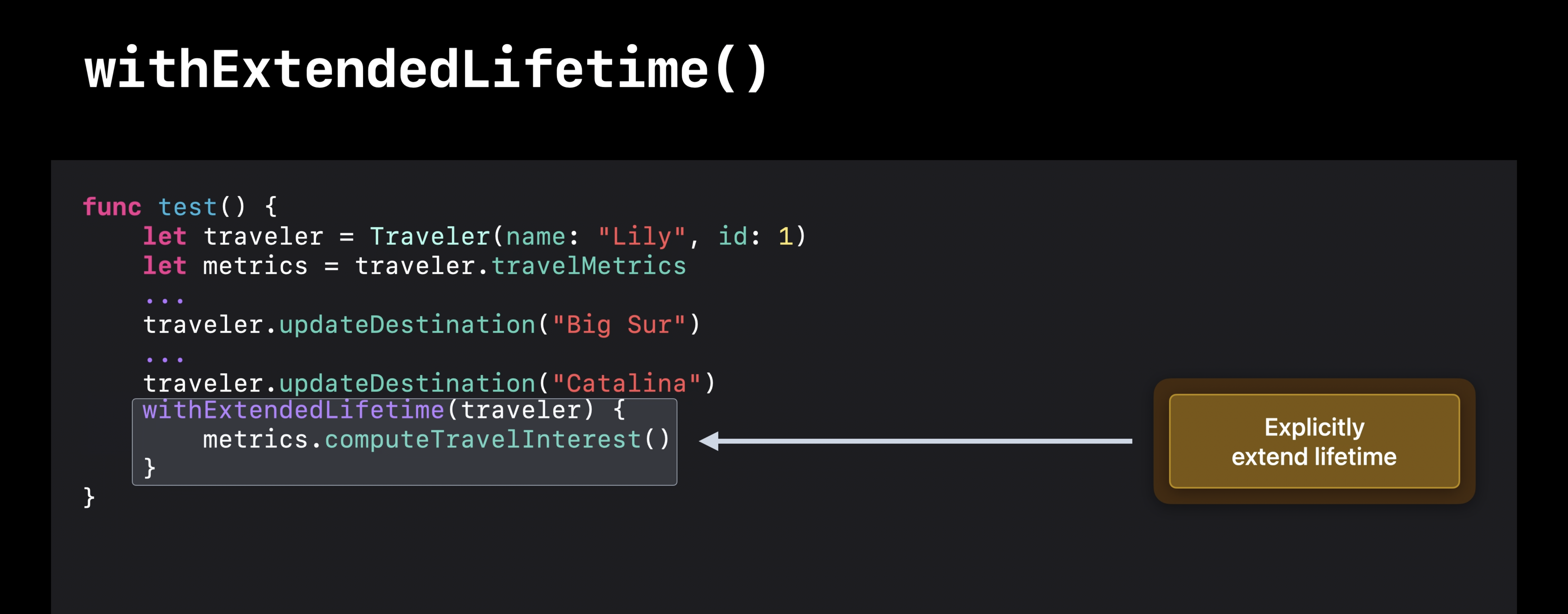 - withExtendedIfetime()을 사용하면 computeTravelInterest()가 실행될 때까지 traveler 객체의 수명을 명시적으로 연장하여 잠재적인 버그를 방지할 수 있음