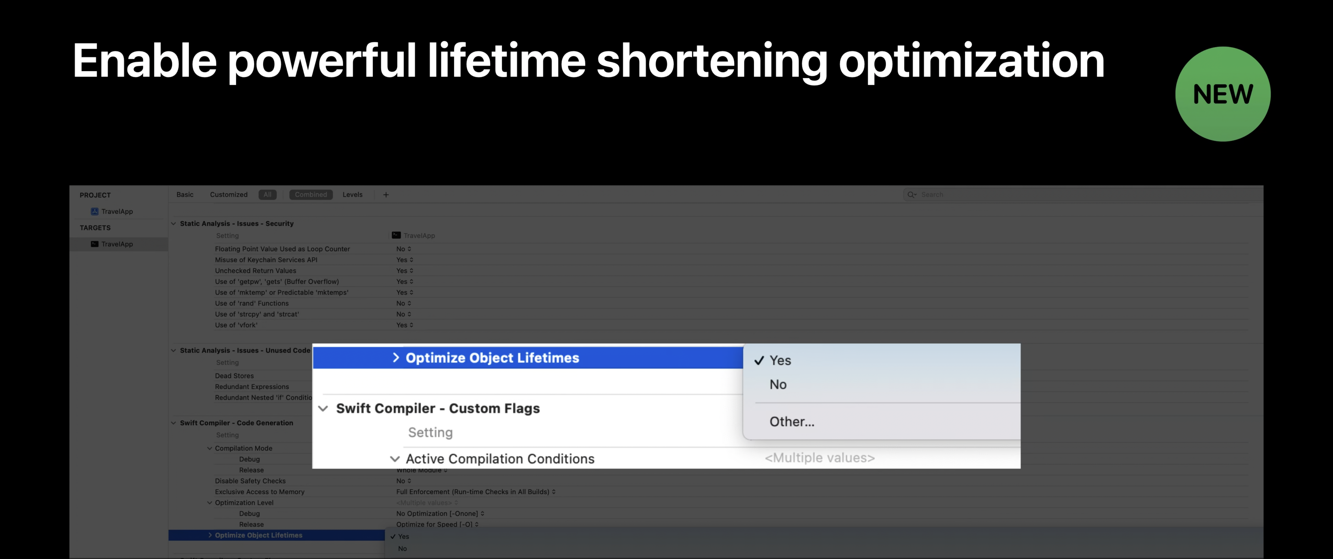 - Xcode 13부터는 "Optimize Object Lifetimes"라는 새로운 실험적 빌드 설정을 Swift 컴파일러에 사용할 수 있음