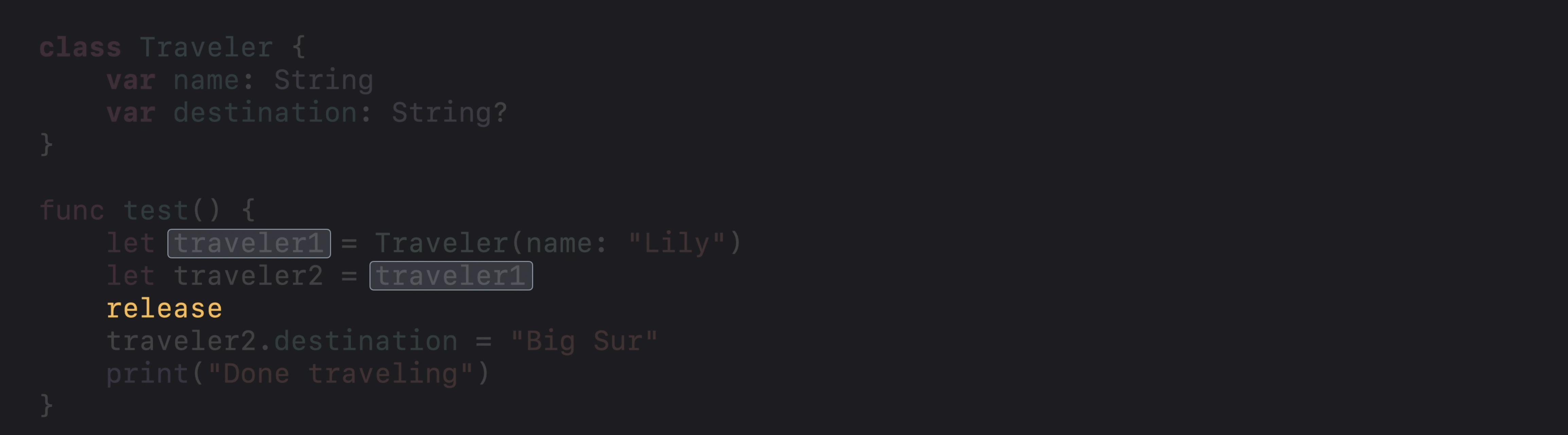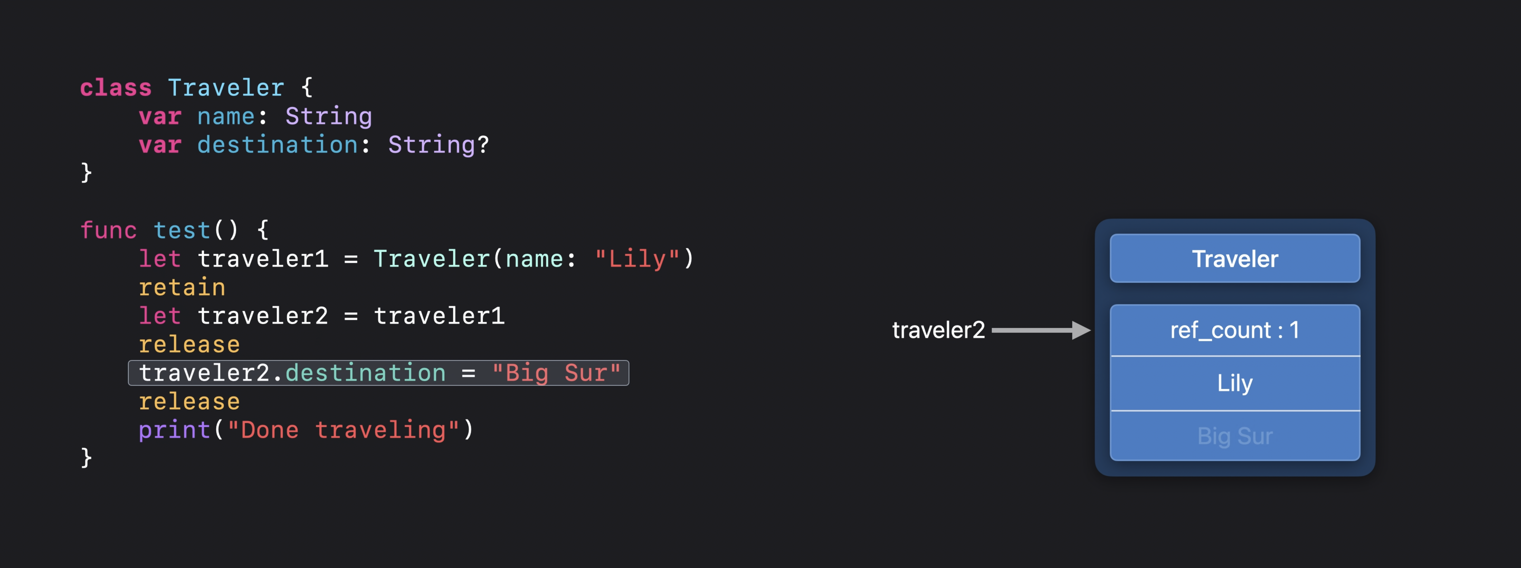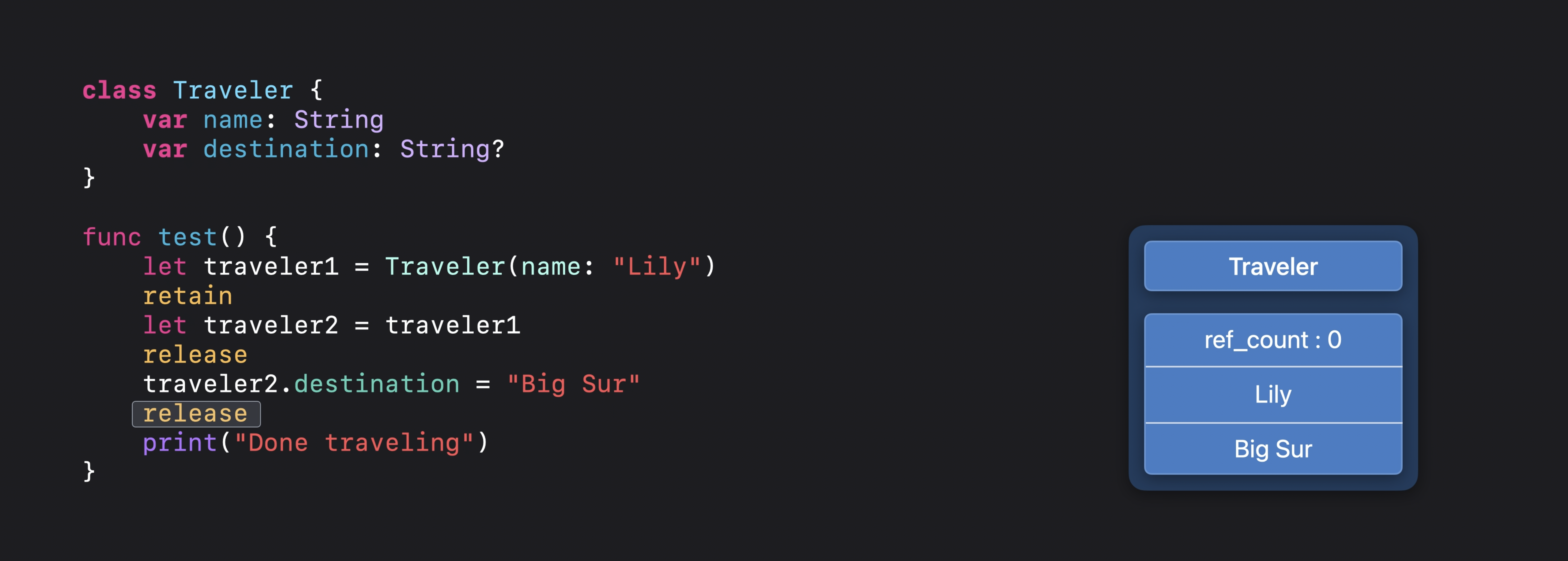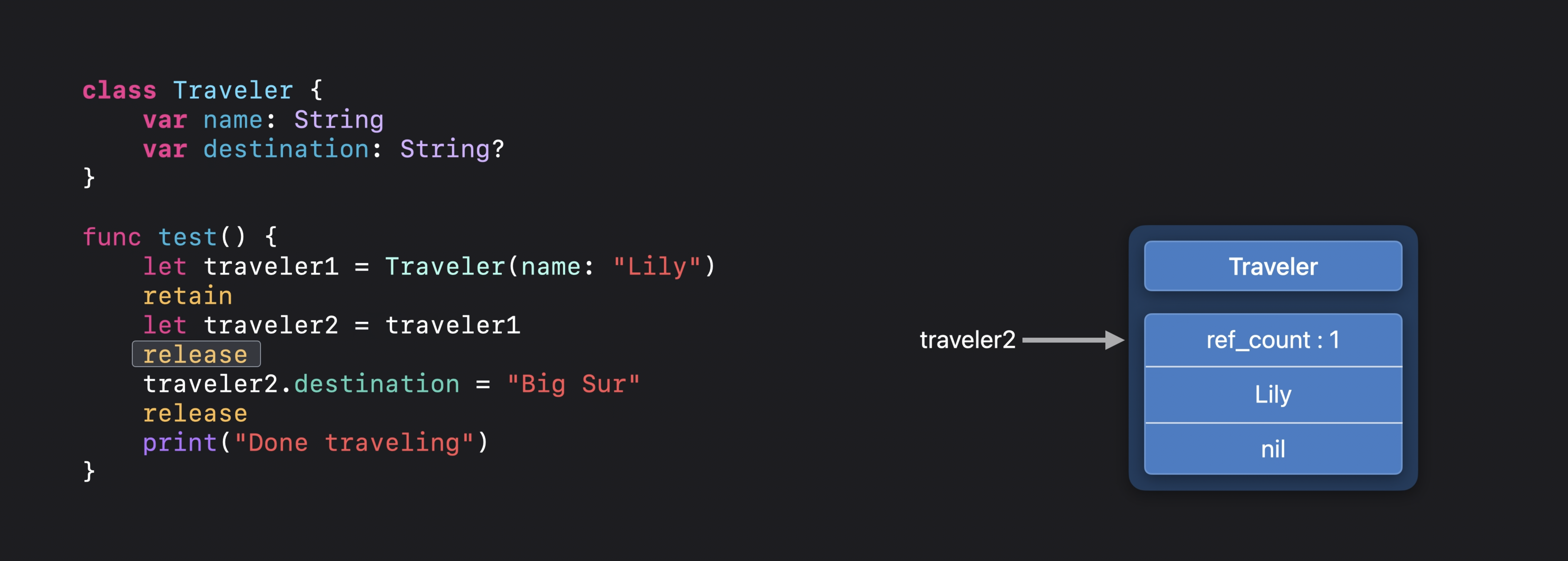 그렇기에 Swift 컴파일러는 traveler 2 아래에서 release 작업을 삽입 - 초기화(initialization)가 참조 횟수를 1로 설정하기 때문에 참조가 시작될 때 retain 작업을 삽입하지 않음