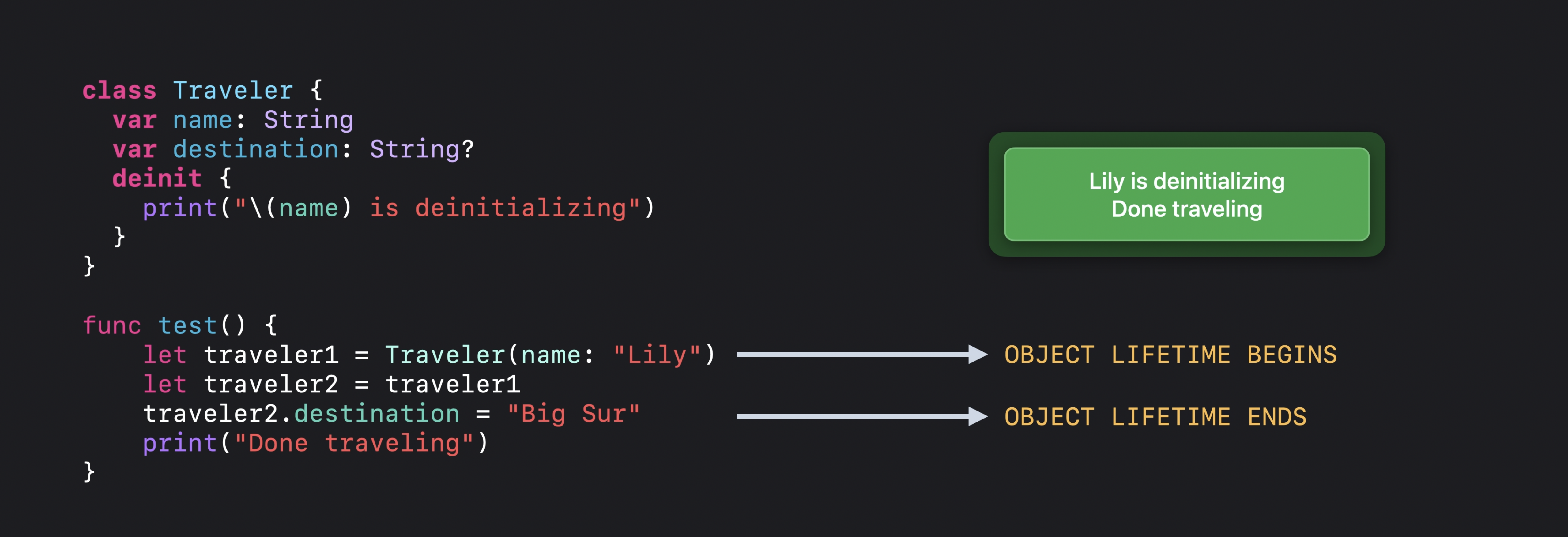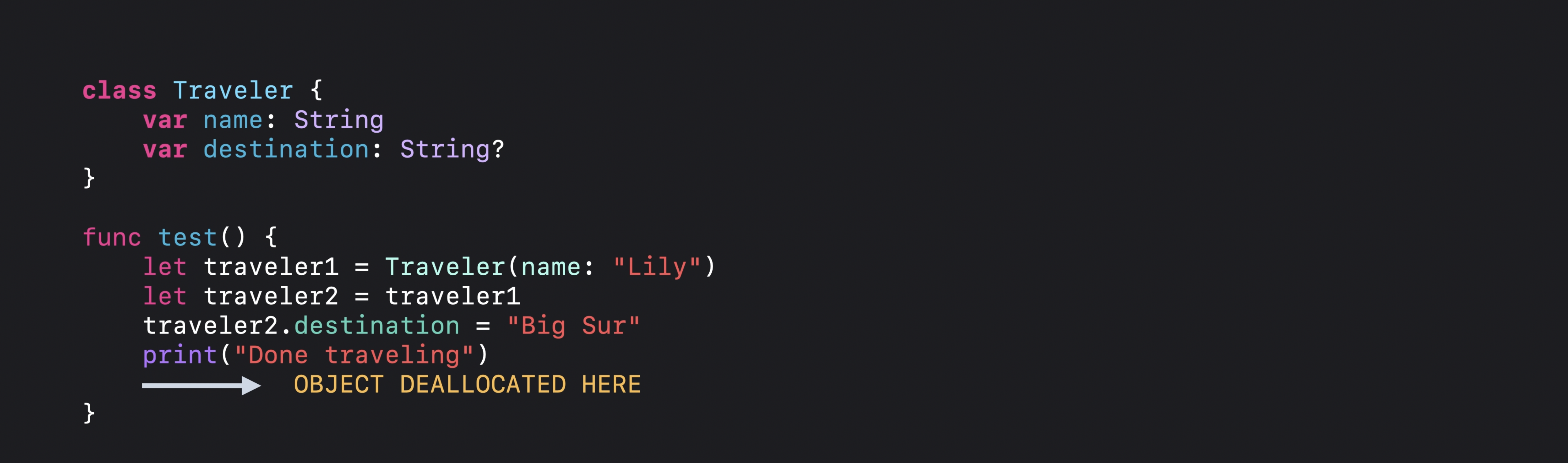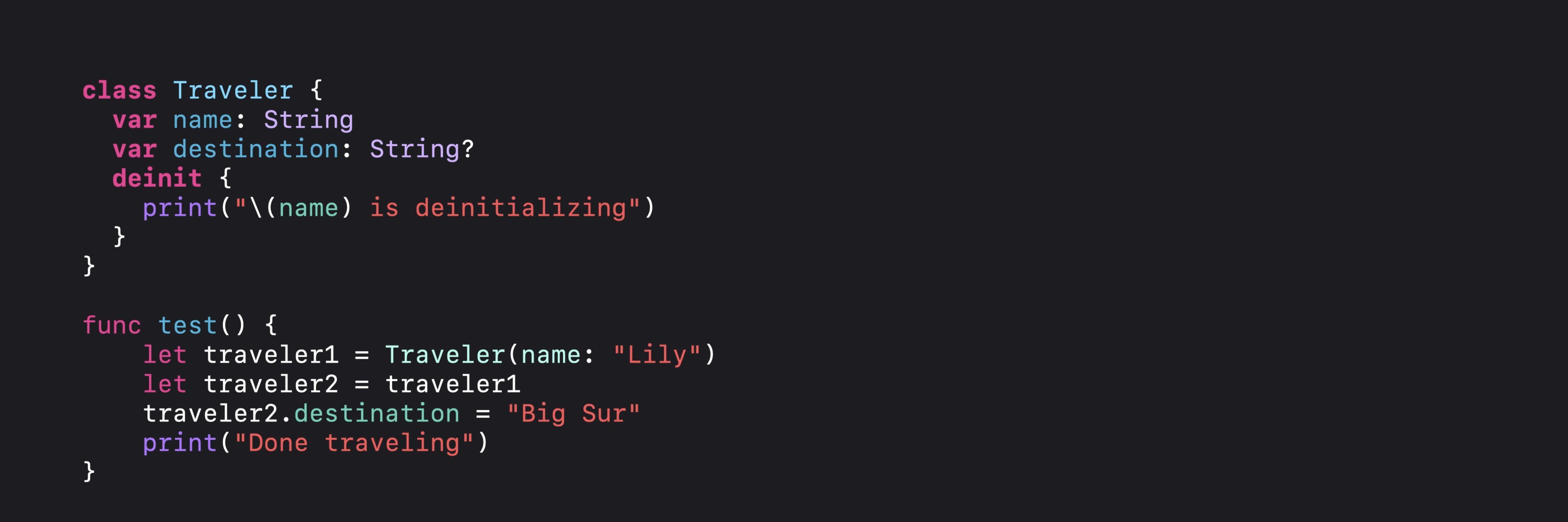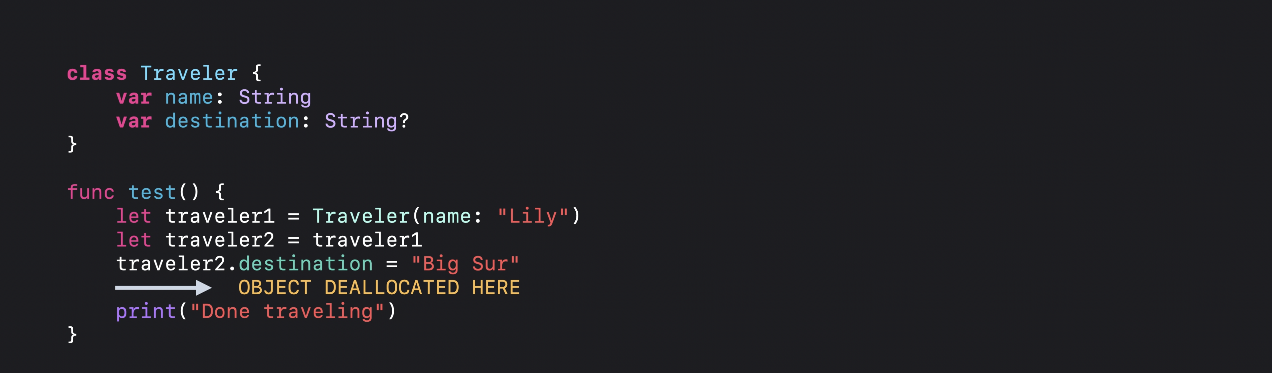 - 하지만 Traveler 객체의 마지막 사용은 Catalina에 대한 destination 업데이트이고, 그 직후 deinitializer가 실행될 수 있음