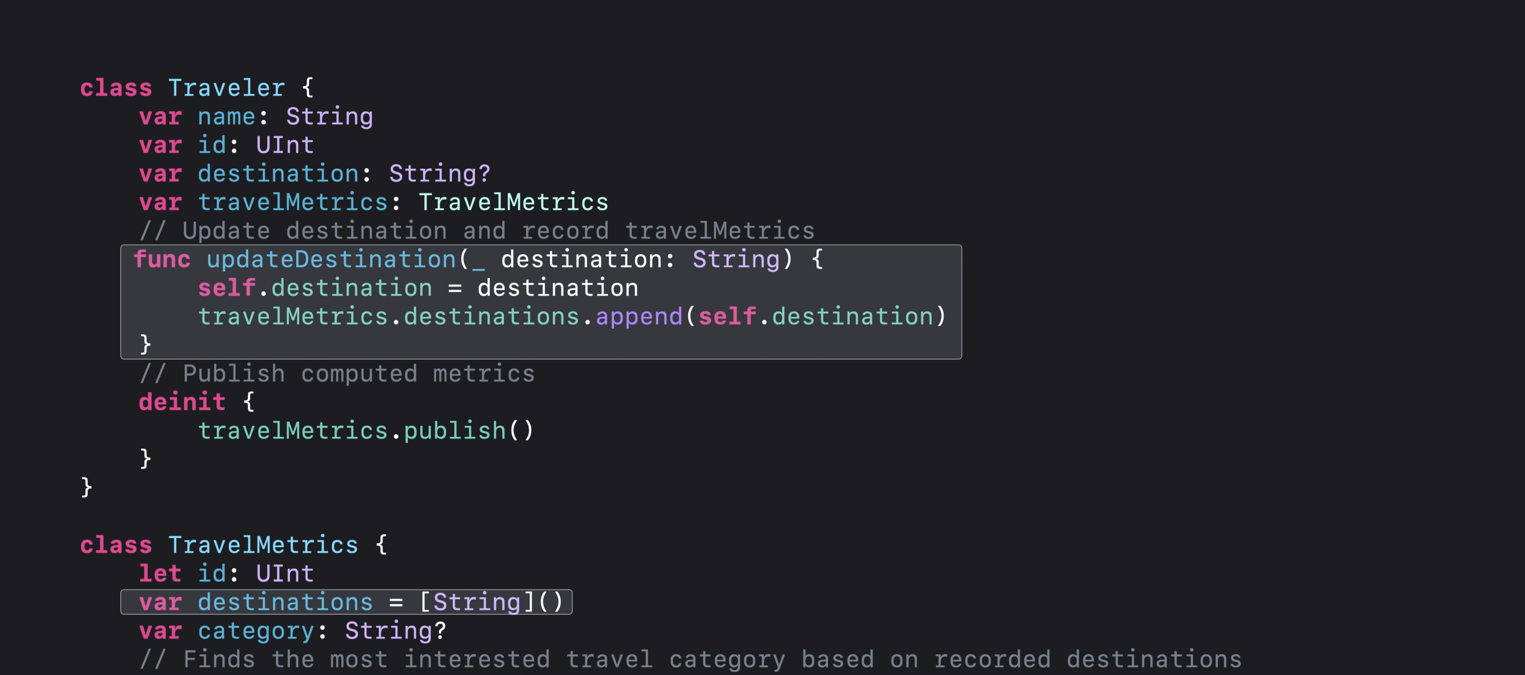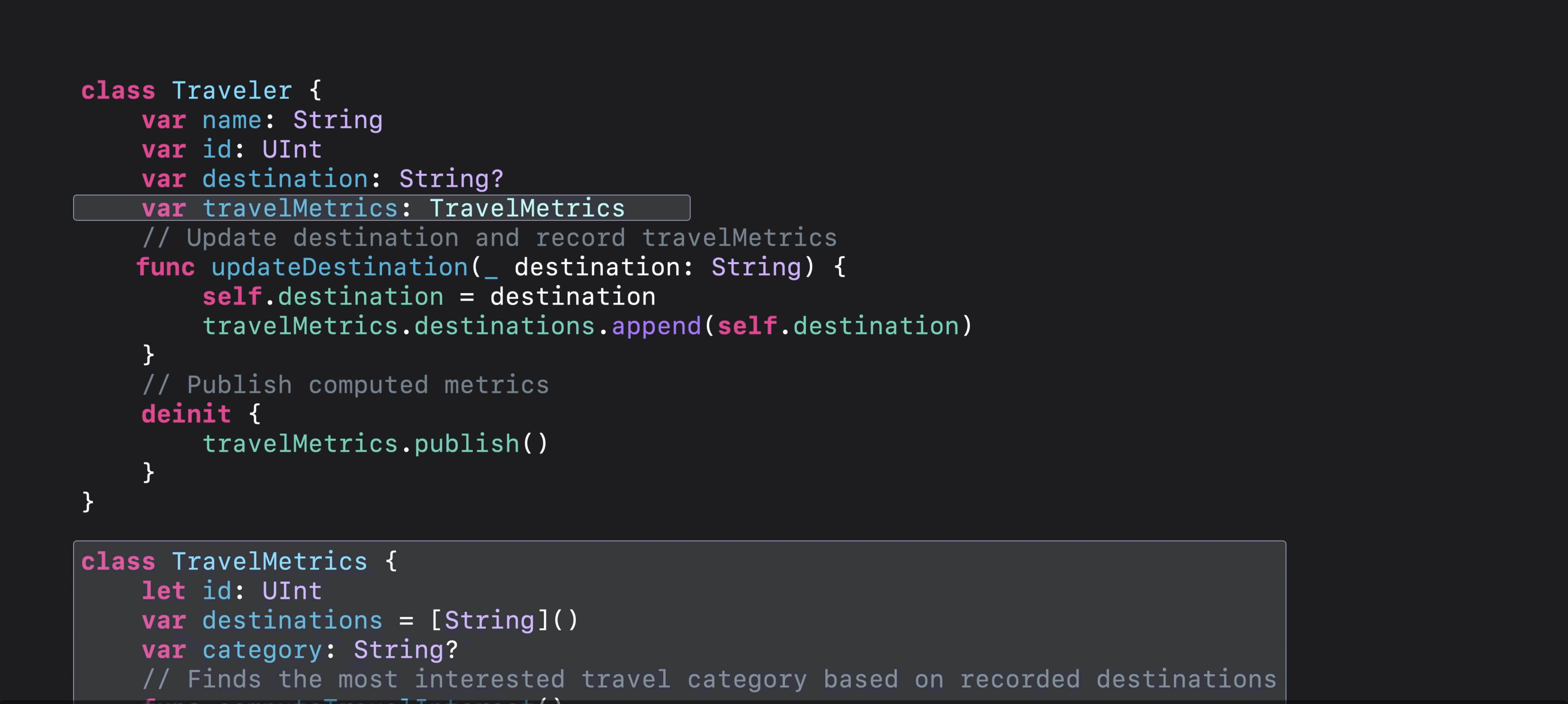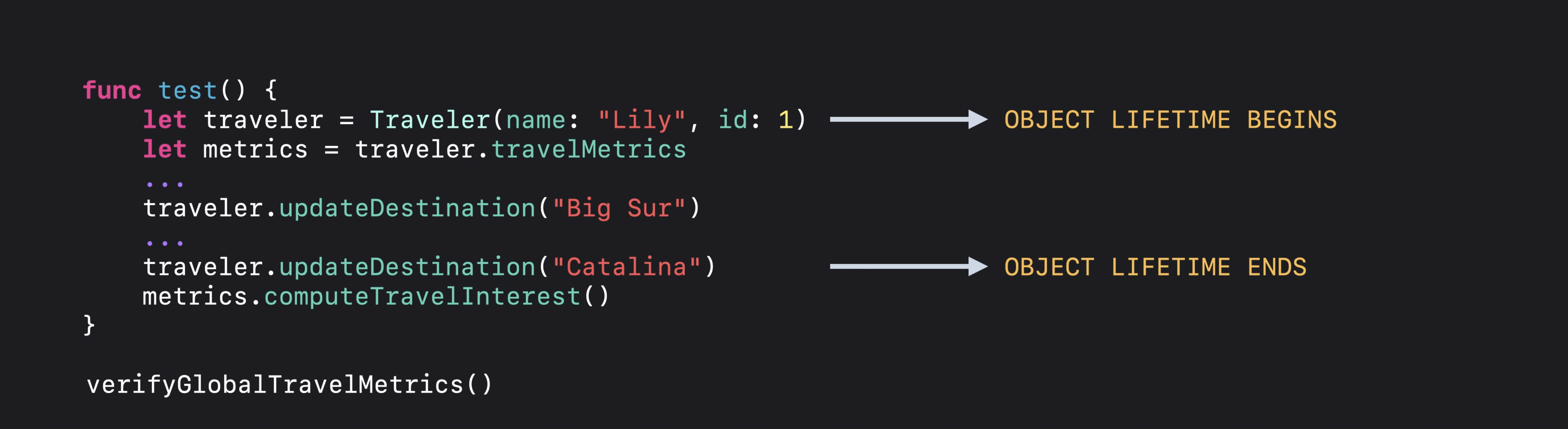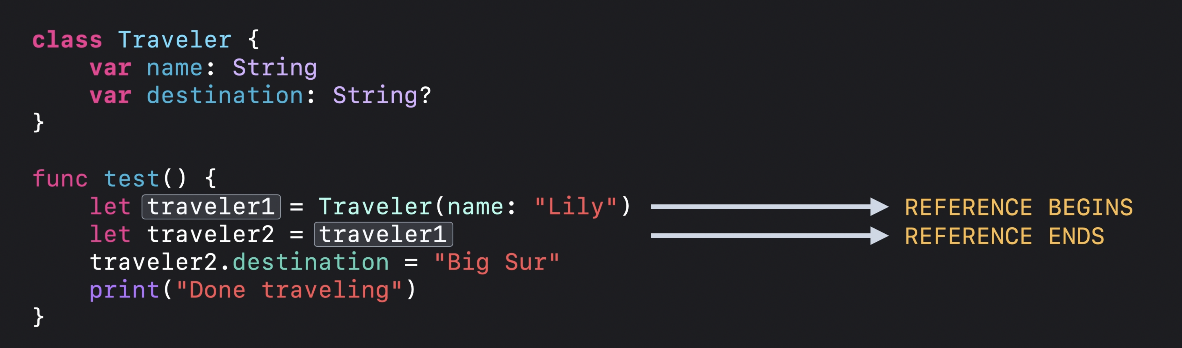 - 하지만 Traveler 객체의 마지막 사용은 Catalina에 대한 destination 업데이트이고, 그 직후 deinitializer가 실행될 수 있음