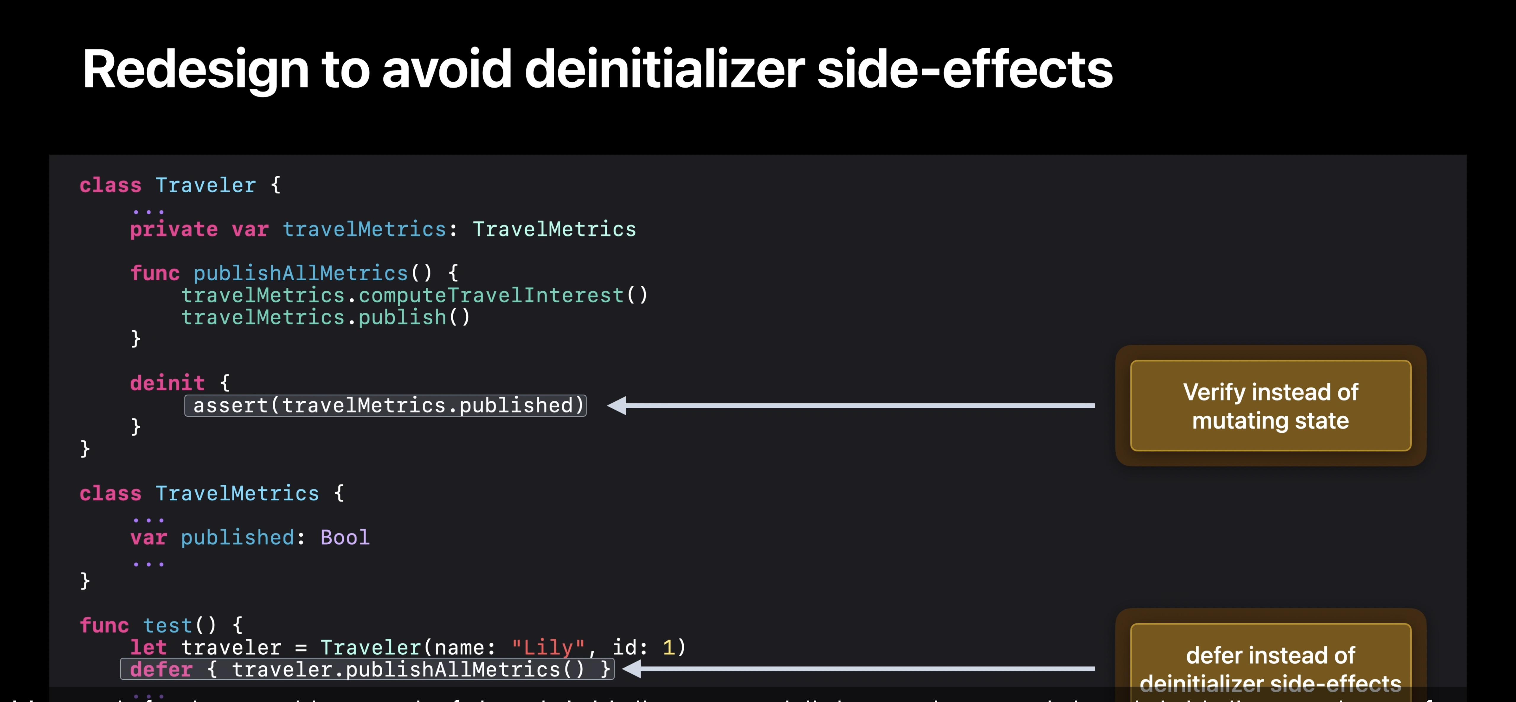 - 위의 방법은 효과가 있지만 보다 원칙적인 접근 방식은 deinitializer의 부작용을 모두 제거하는 것.