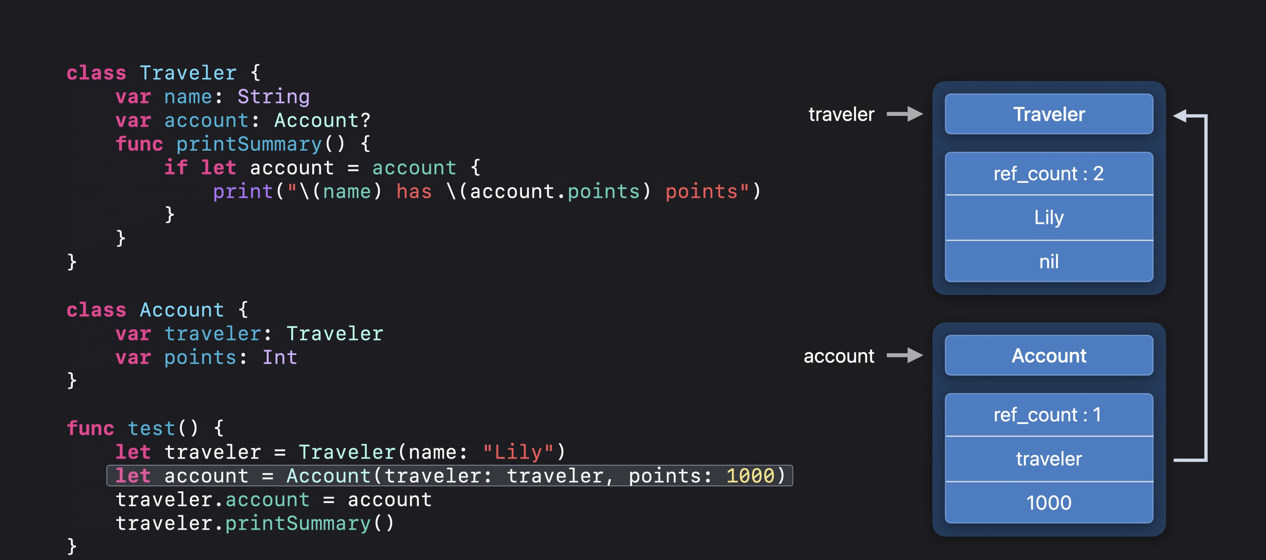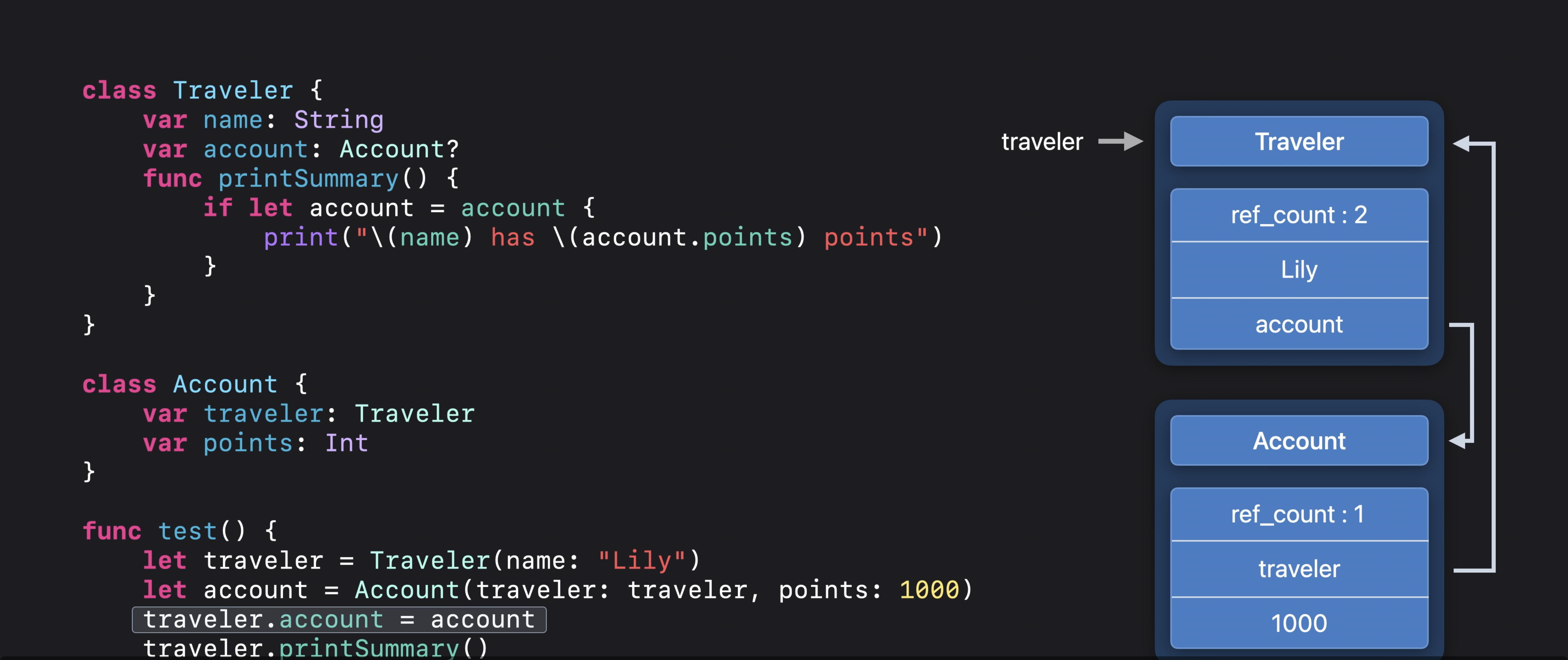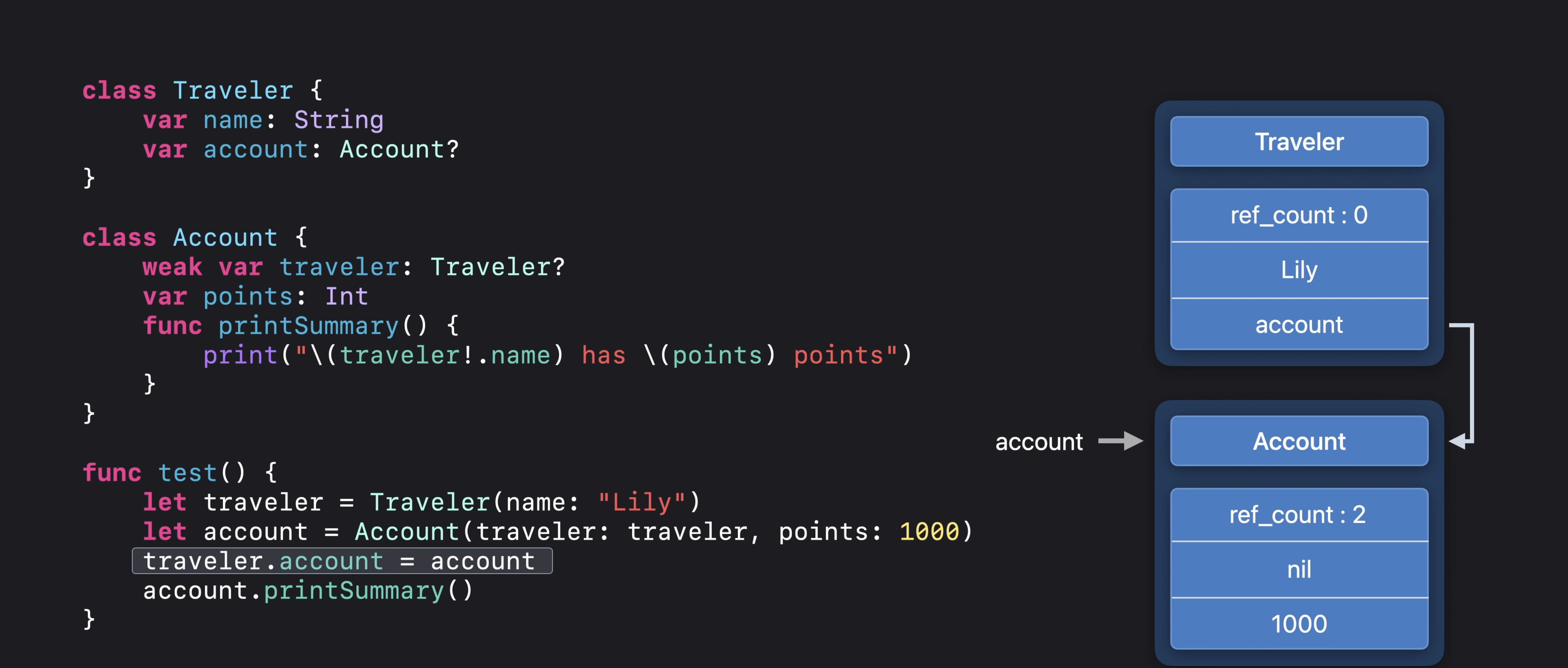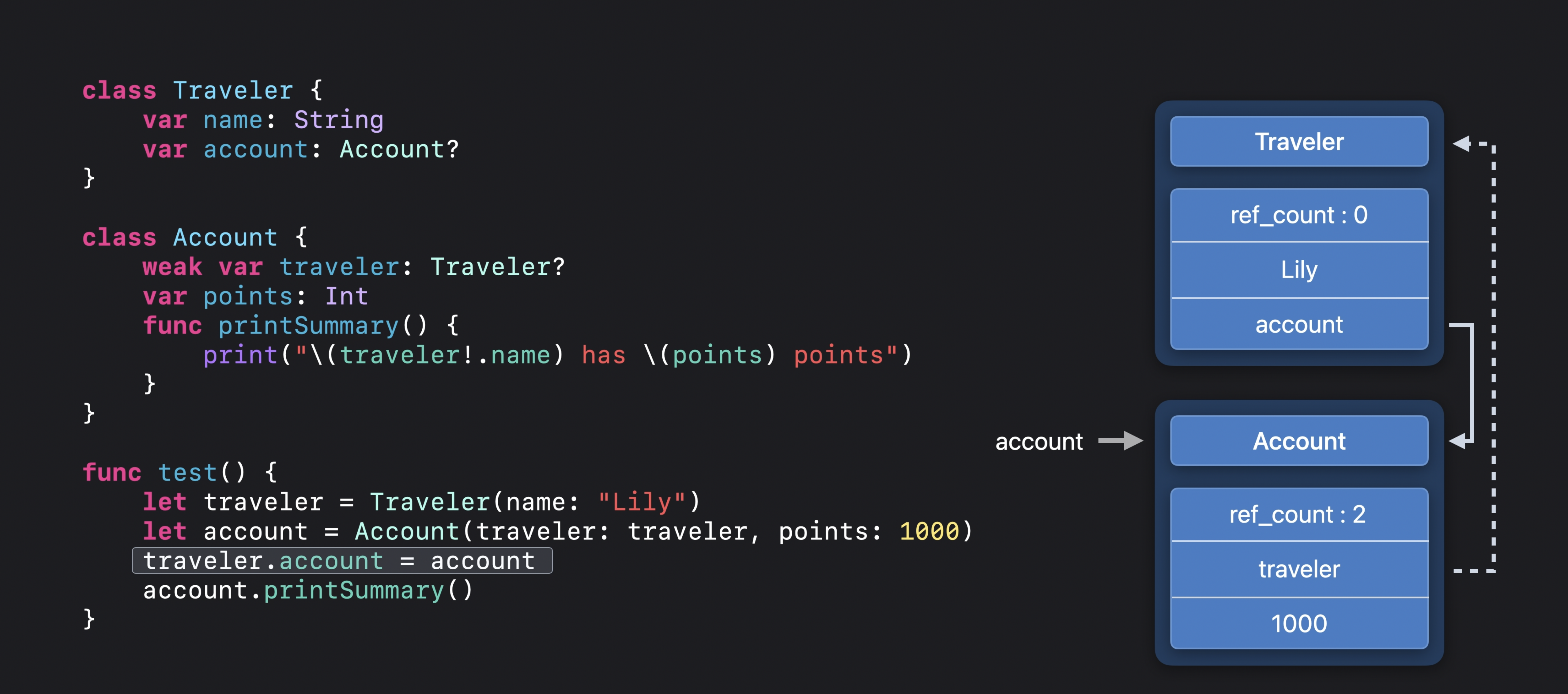 참조 횟수가 0이 되면 약한 참조를 통한 Account의 Traveler 객체에 대한 접근이 nil이 되고 Traveler 객체의 할당이 취소될 수 있음