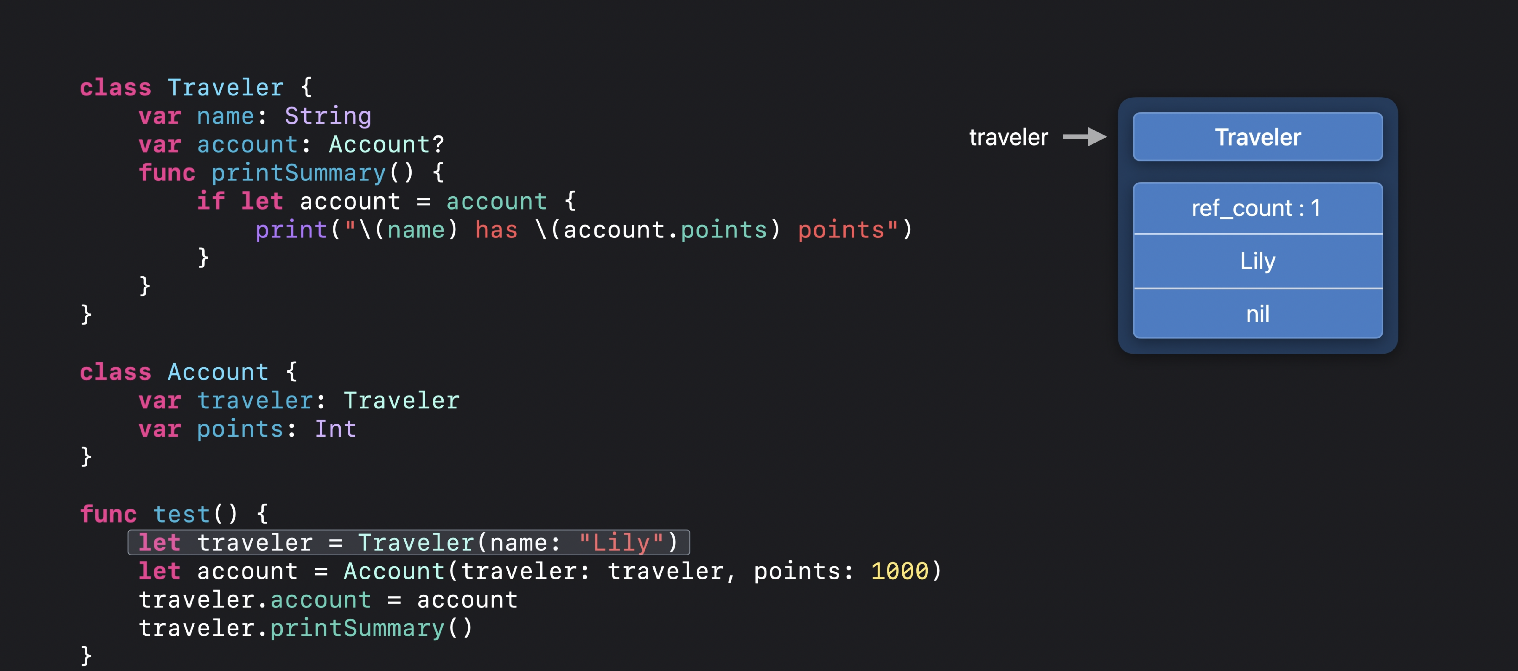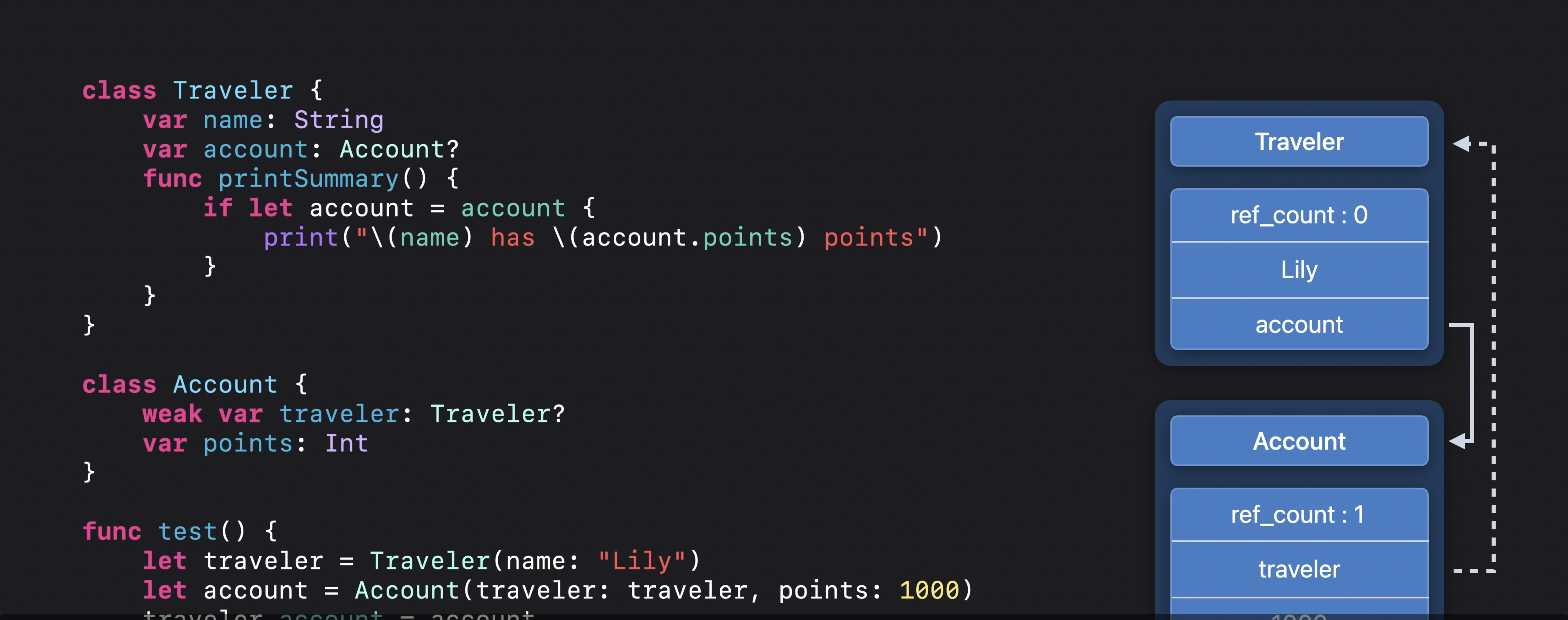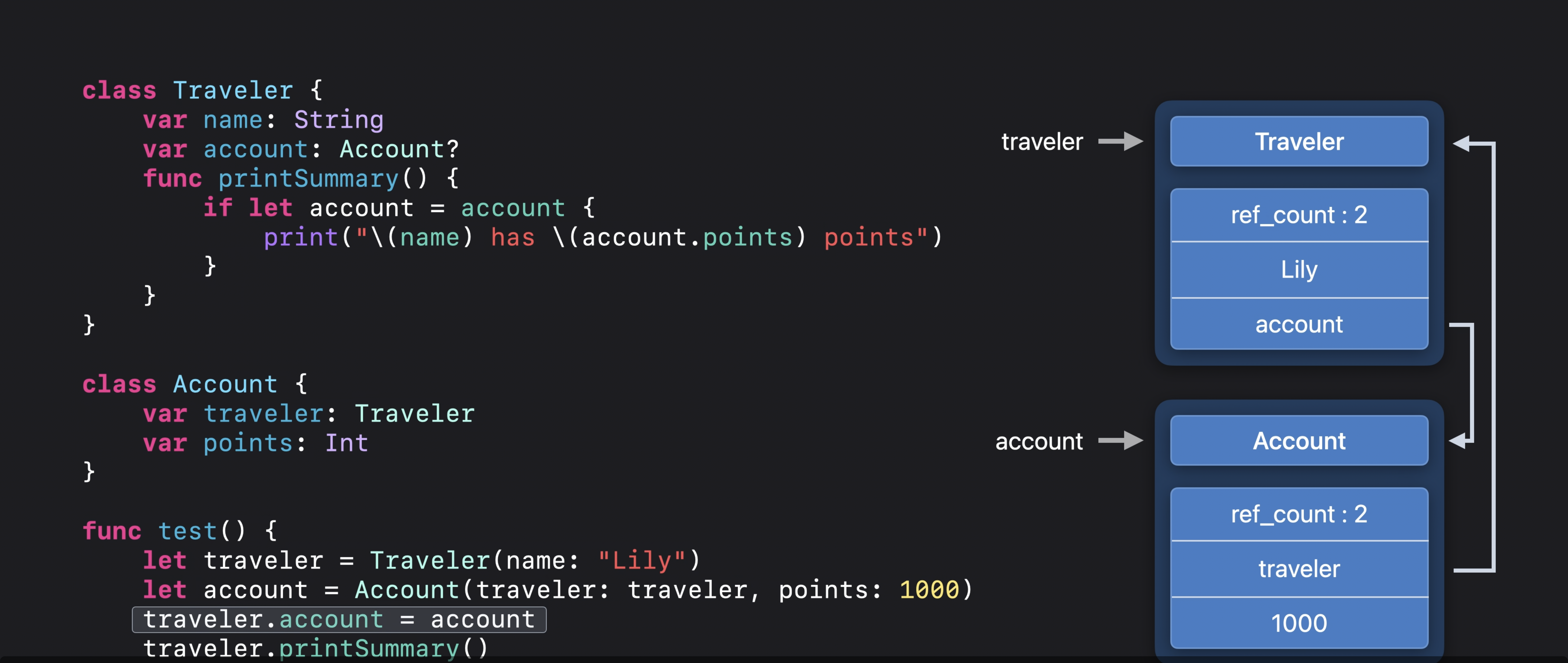 참조 횟수가 0이 되면 약한 참조를 통한 Account의 Traveler 객체에 대한 접근이 nil이 되고 Traveler 객체의 할당이 취소될 수 있음