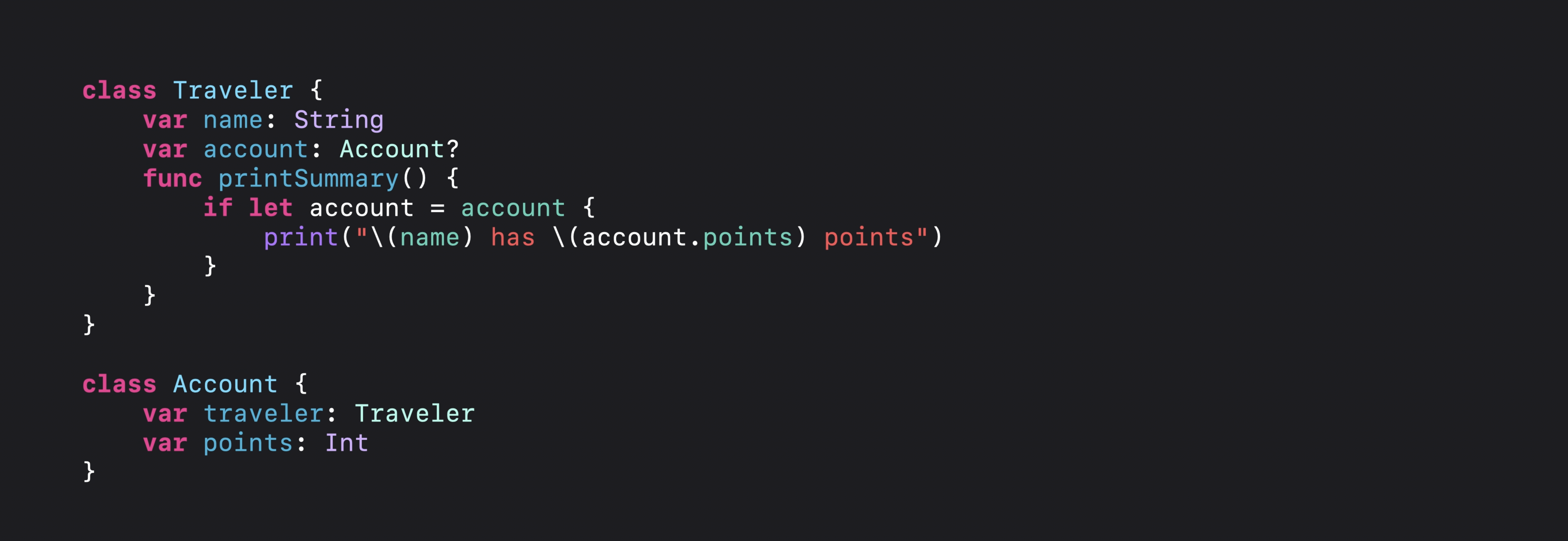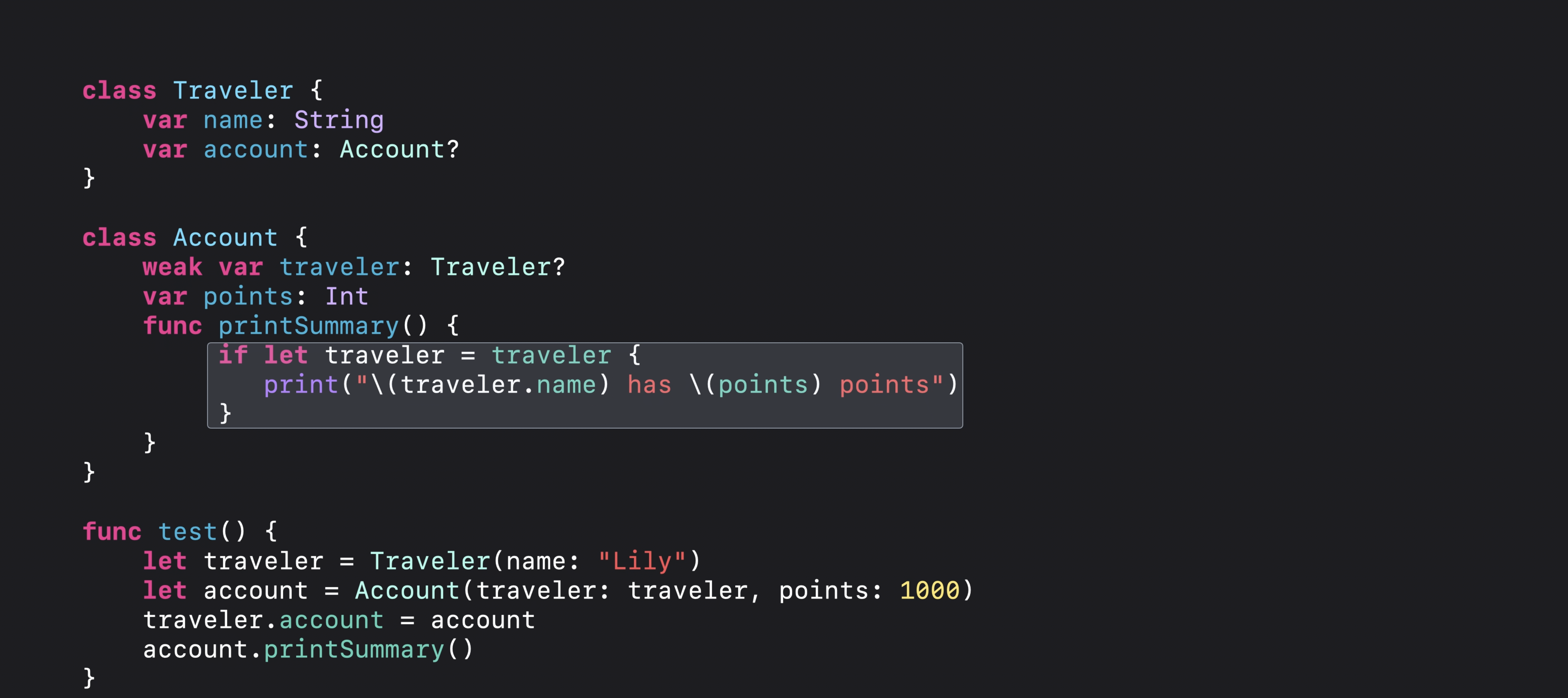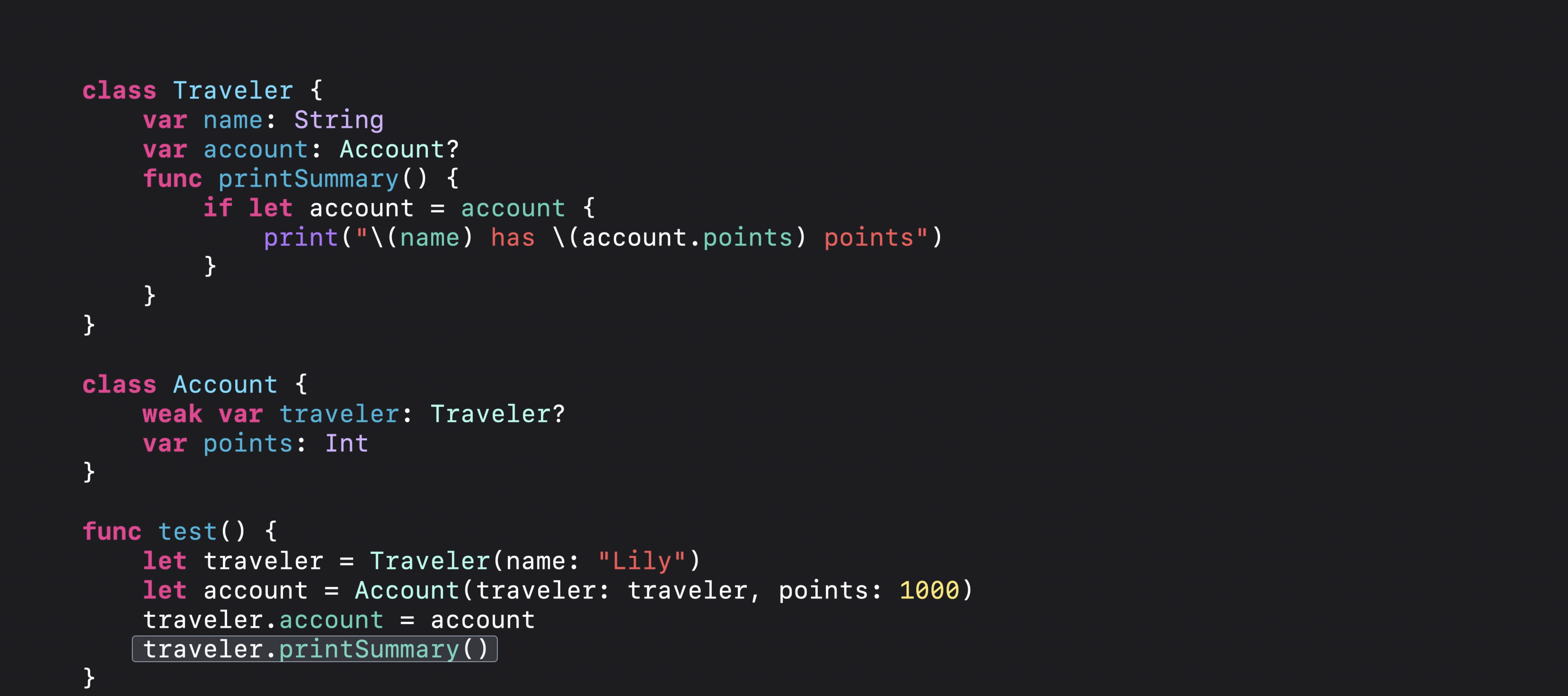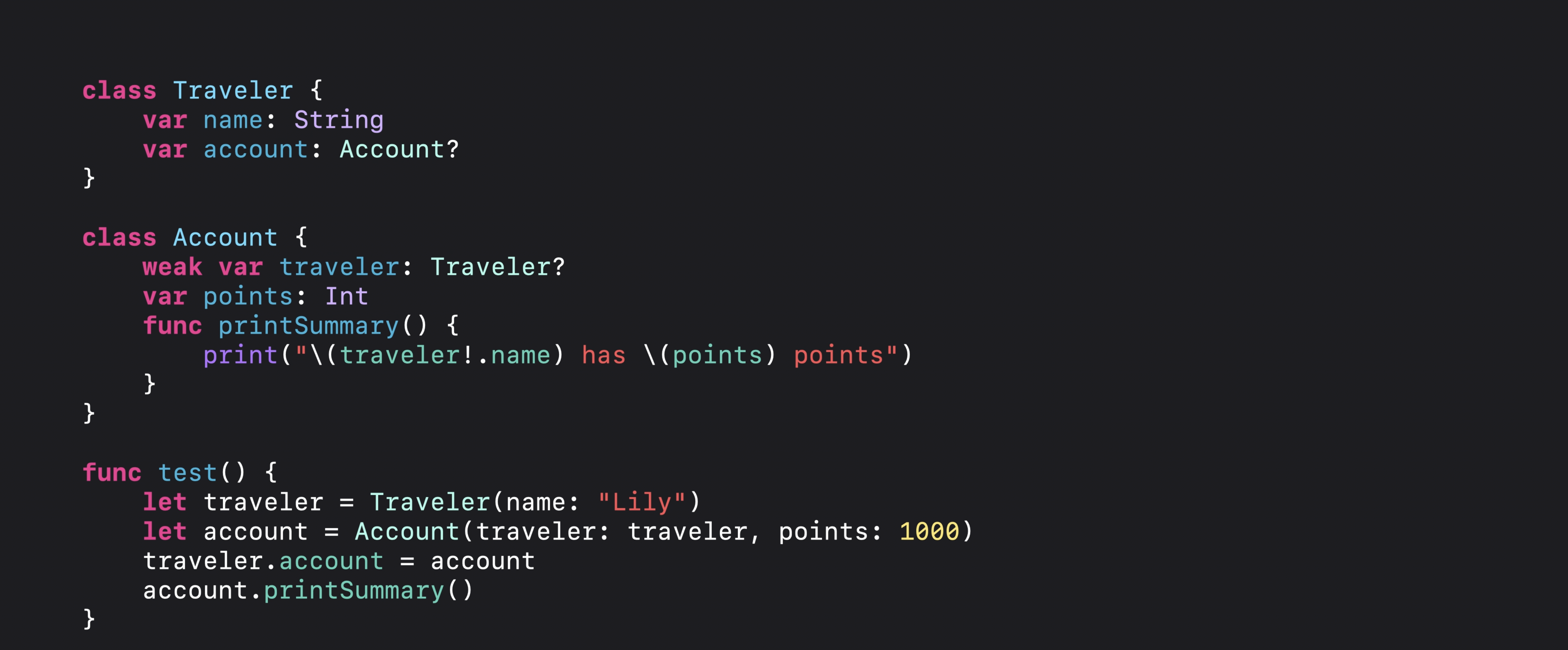 참조 횟수가 0이 되면 약한 참조를 통한 Account의 Traveler 객체에 대한 접근이 nil이 되고 Traveler 객체의 할당이 취소될 수 있음