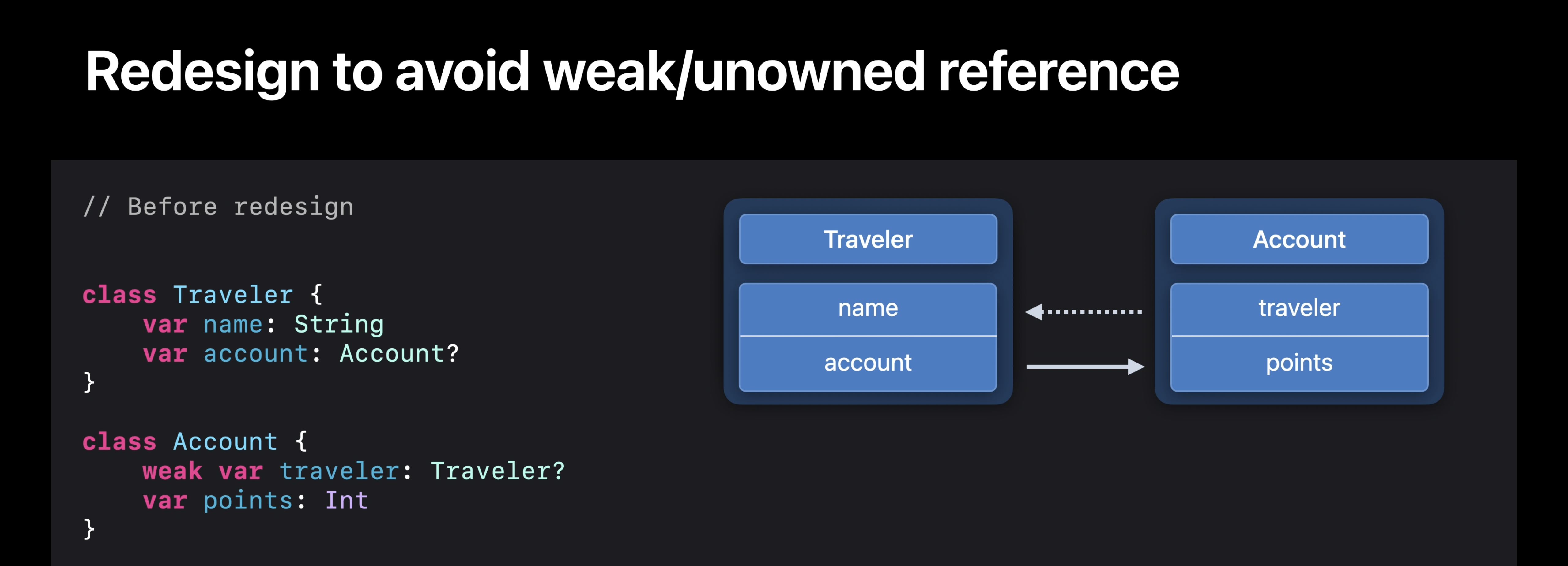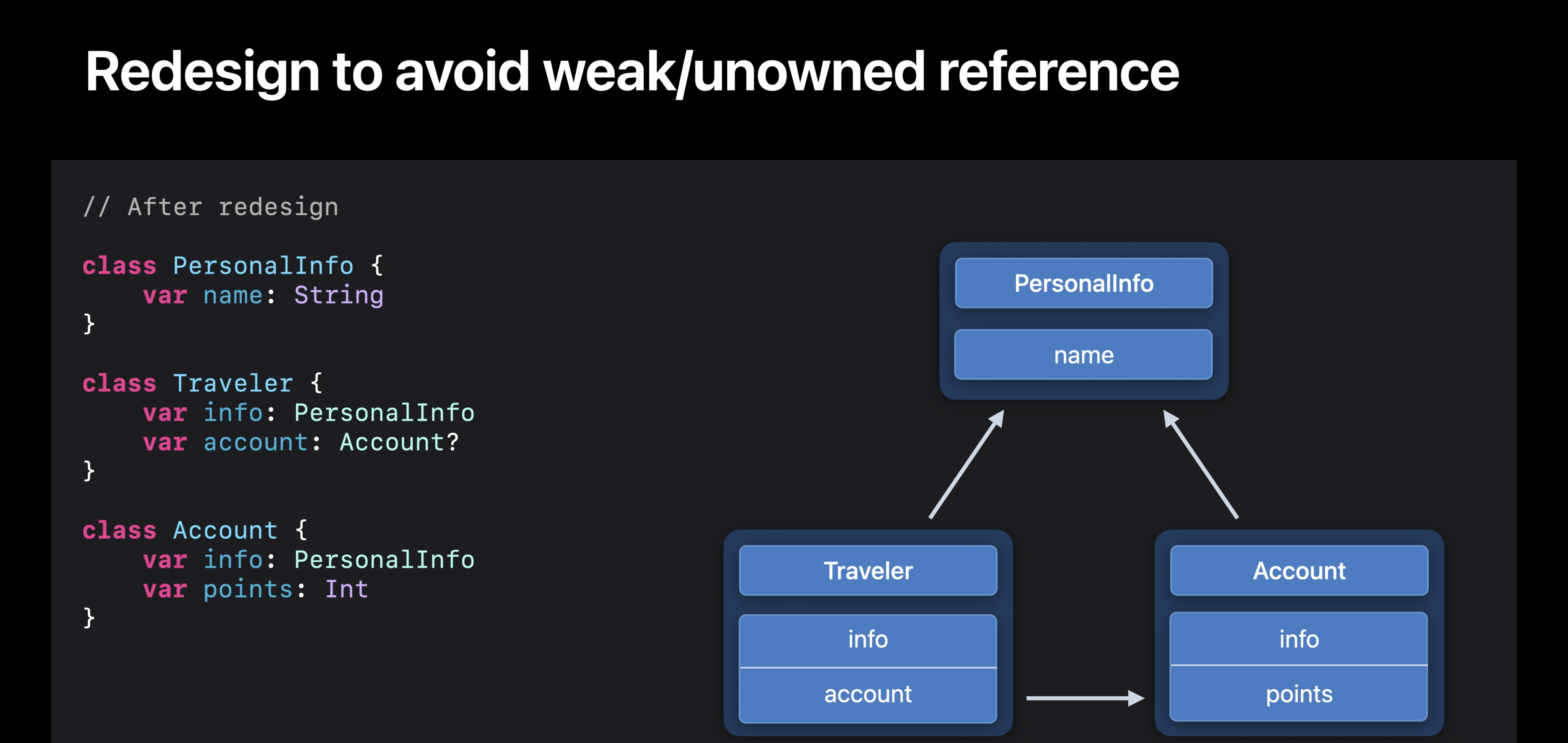 - weak, unowned 참조의 필요성을 피하는 것은 추가 구현 비용이 있을 수 있지만(PersonalInfo 같은 추가 클래스를 구현하는) 이는 모든 잠재적 객체 수명 버그를 제거하는 확실한 방법임