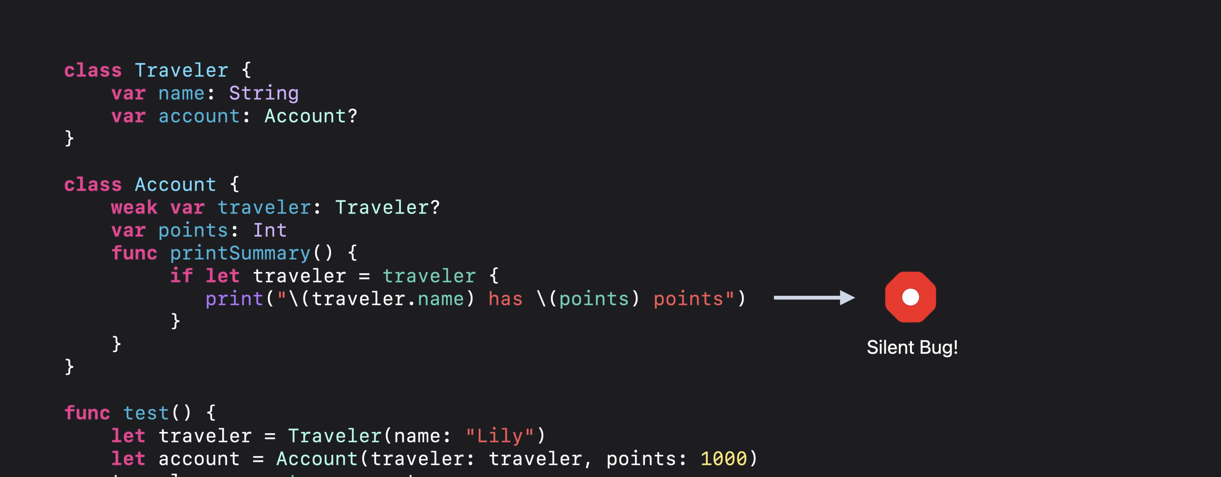 - 클래스 설계에 주의하지 않으면 약한 참조와 소유되지 않은 참조는 성능 비용을 수반할 뿐만 아니라 버그를 노출할 수 있음