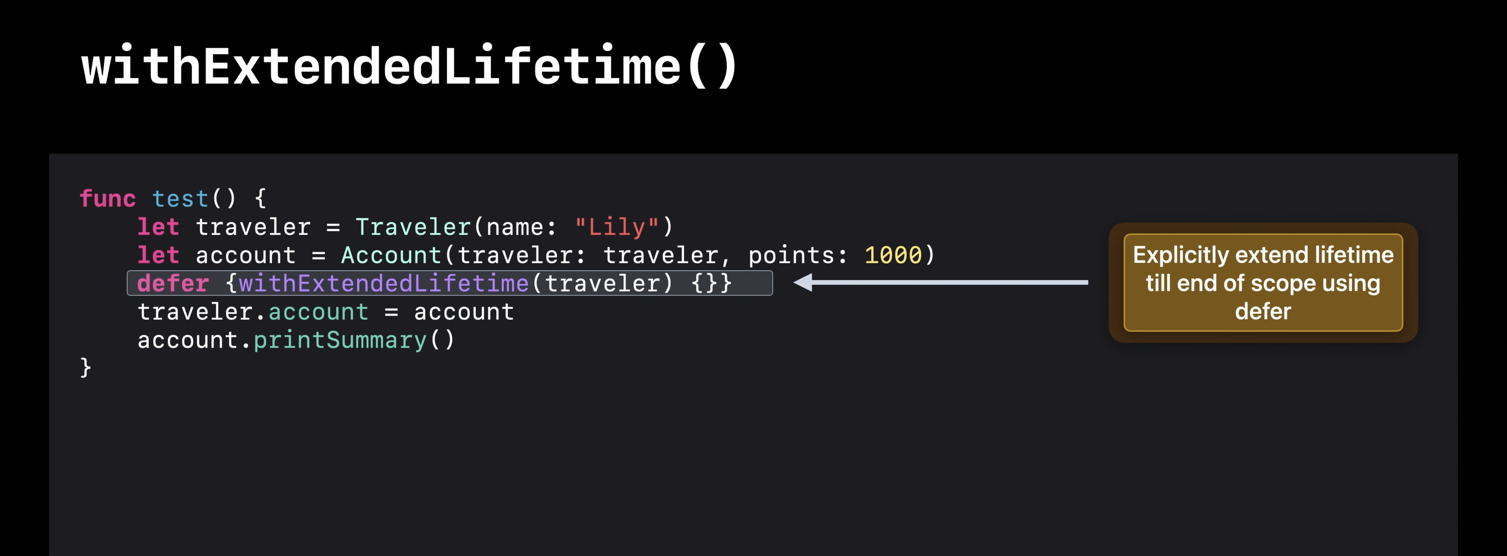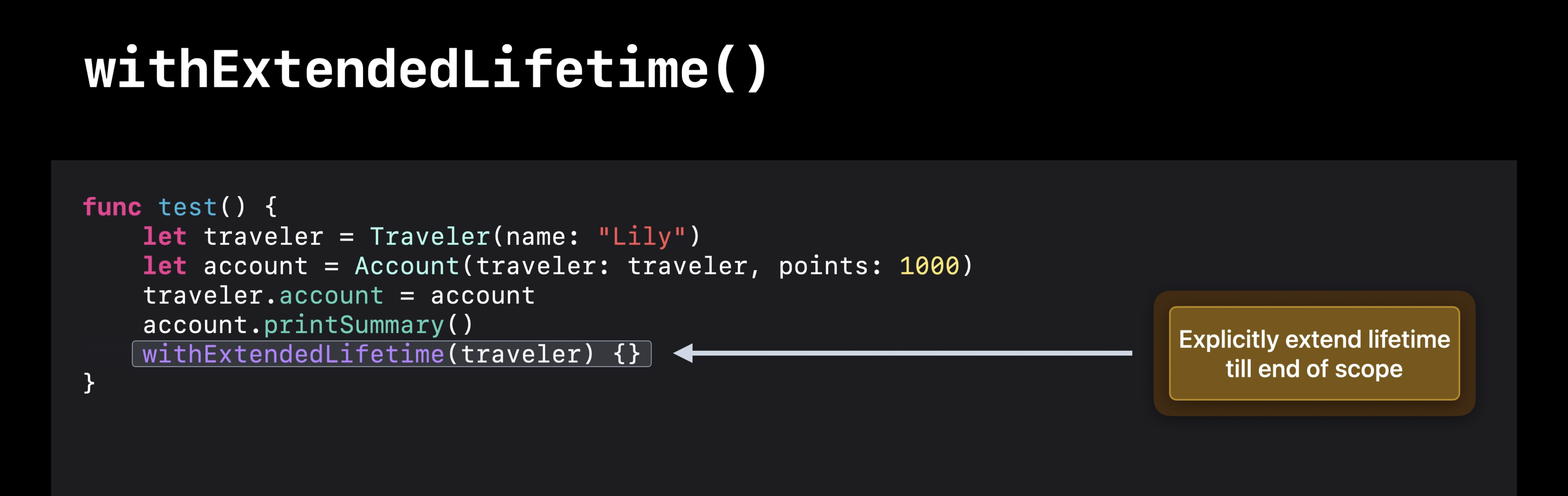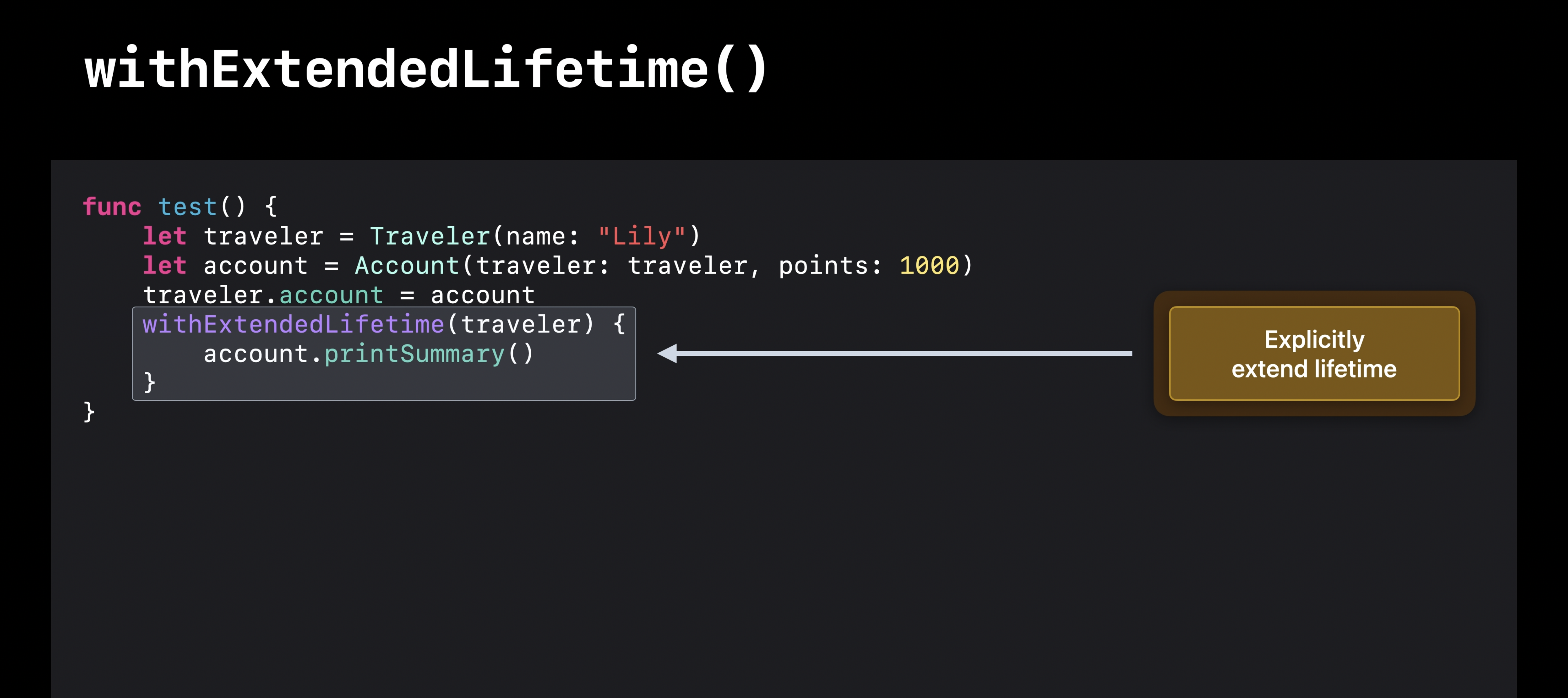 - Swift는 객체의 수명을 명시적으로 연장할 수 있는 withExtendedLifetime() 유틸리티를 제공