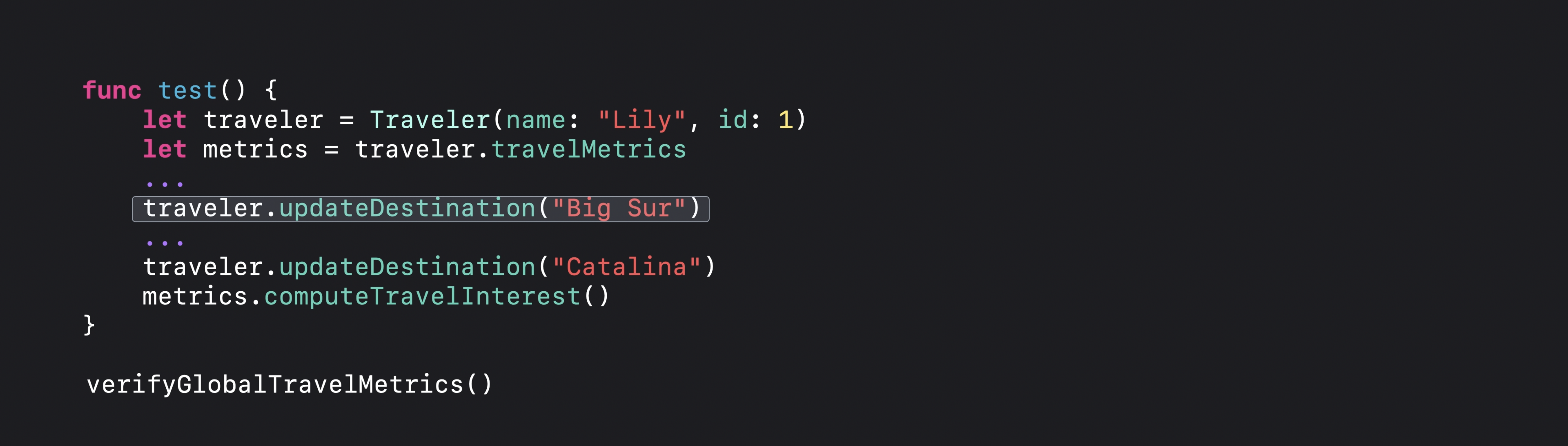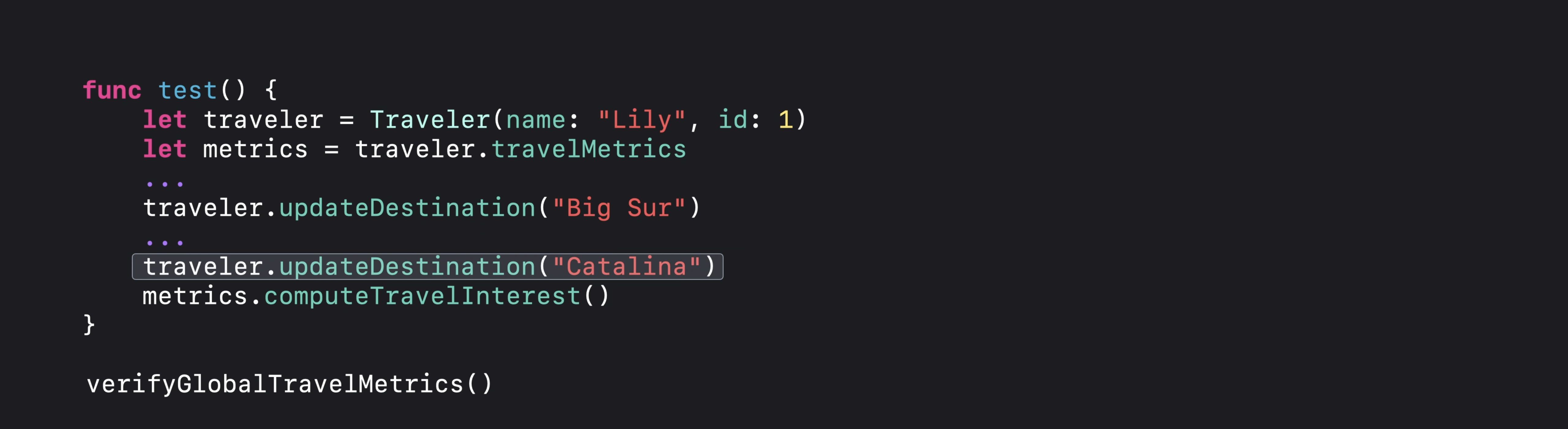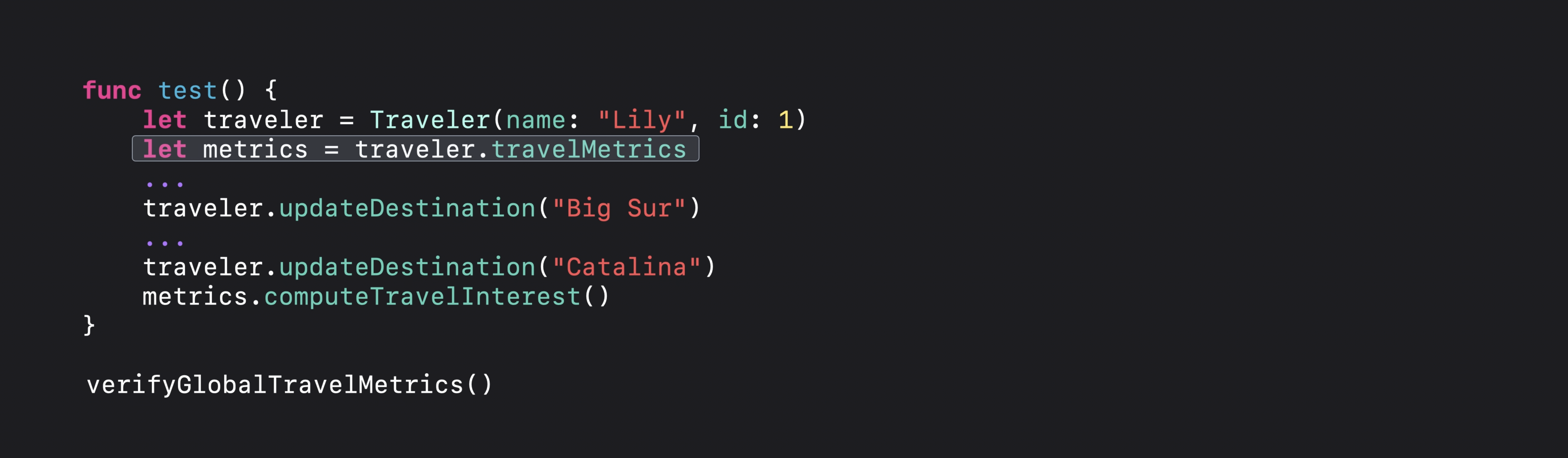 - test() 함수에서 먼저 Traveler 객체가 생성된 다음 travelMetrics에 대한 참조가 Traveler 객체에서 복사됨