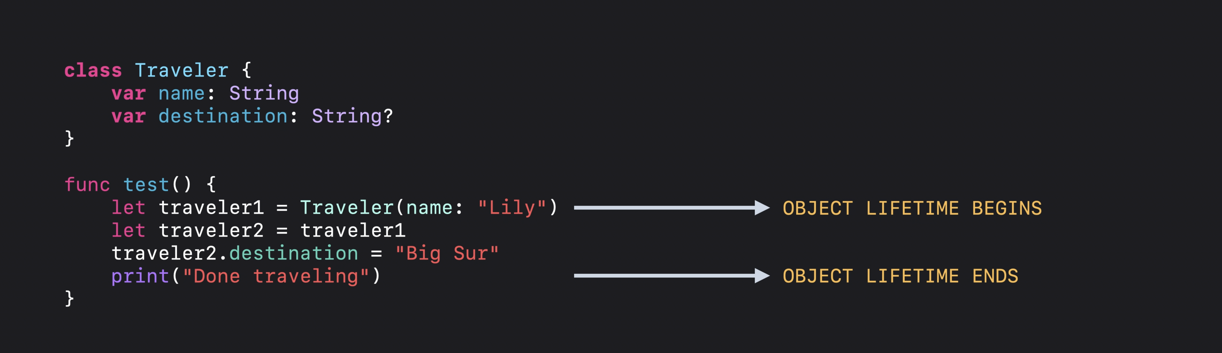 - Swift에서 객체의 수명은 초기화에서 시작하여 마지막 사용에서 끝남
