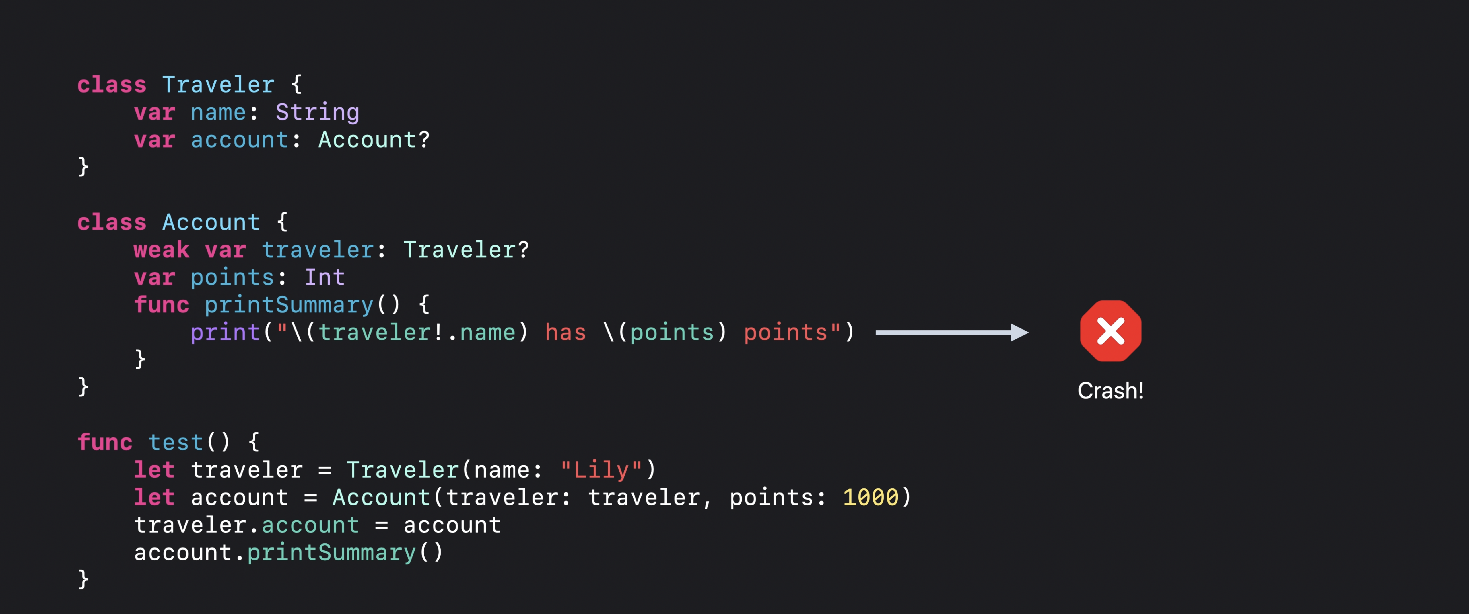 - 따라서 printSummary() 함수가 호출되면 약한 참조를 했던 Traveler의 강제 언래핑(force unwrap)이 trap되어 충돌을 일으킨다