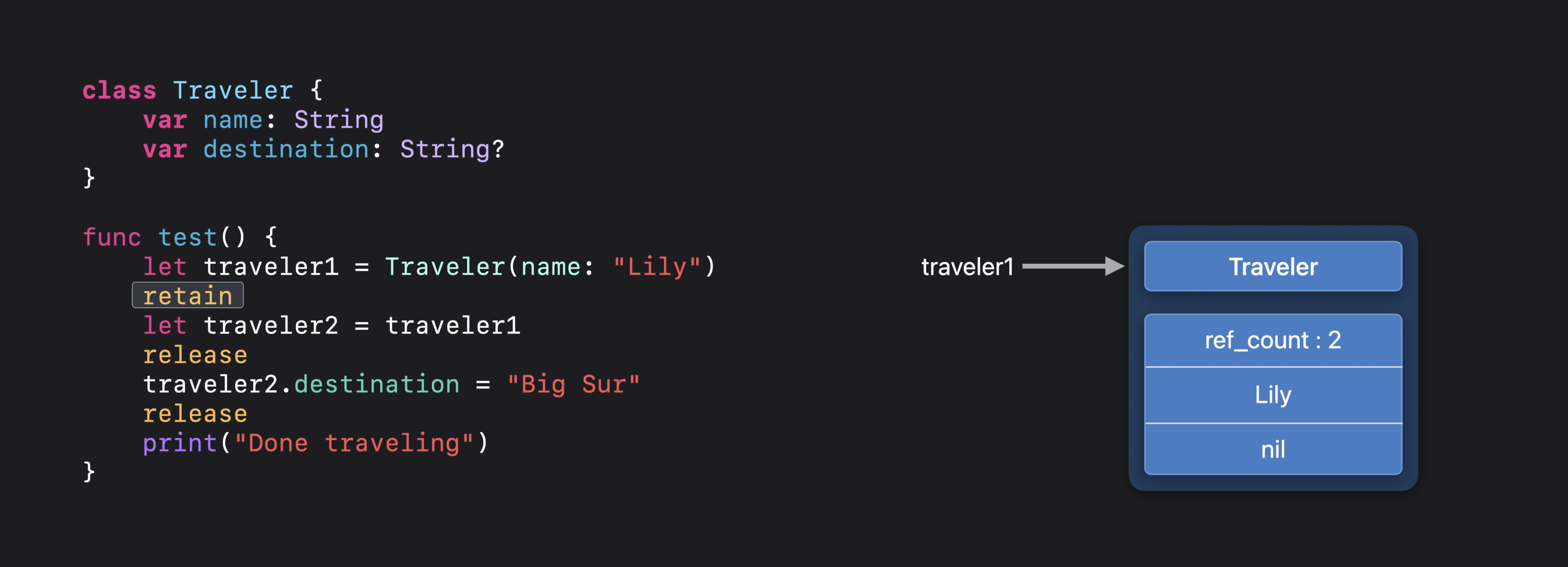 - traveler 1때에는 Traveler(name:)으로 초기화 하면서 참조 횟수가 1이 되기 때문에 따로 retain이 없었지만, traveler 2는 이미 초기화 된 것을 작업하는 것이기에 retain 작업이 삽입됨