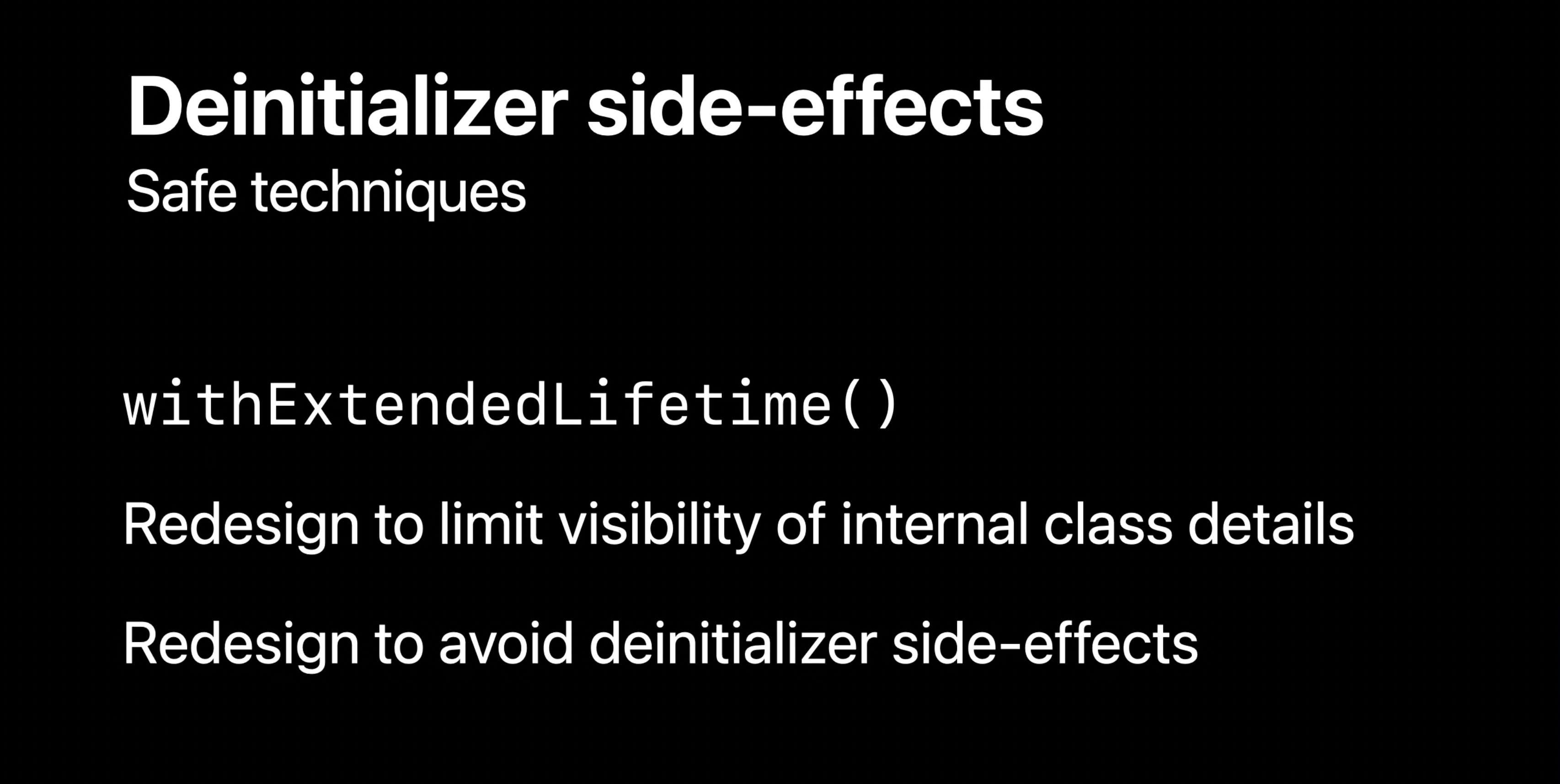 - weak, unowned 참조와 마찬가지로 deinitializer도 부작용을 안전하게 처리하는 다양한 기술이 있음