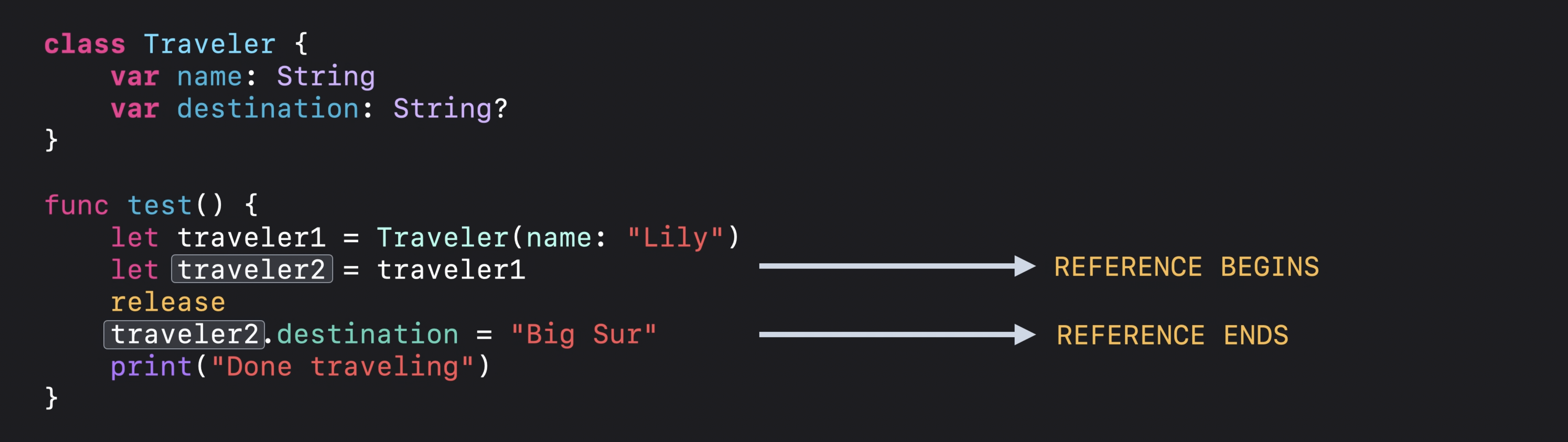 (Object's lifetime begins at init() and ends at last use) - ARC는 객체의 수명이 다한 후에 객체 할당을 해제하여 자동으로 메모리를 관리함