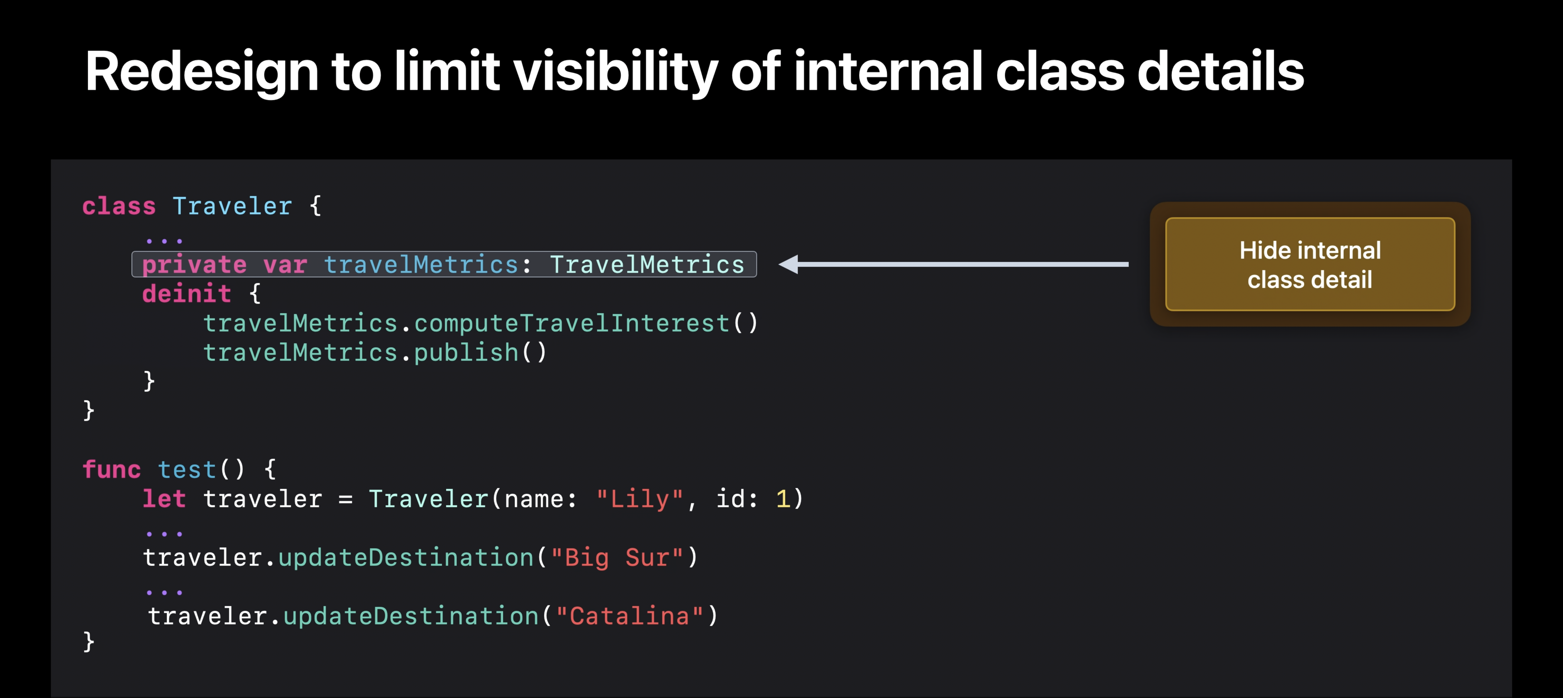 - 위의 코드에서 travelMetrics는 private로 표시되어 외부 접근으로부터 숨겨진다
