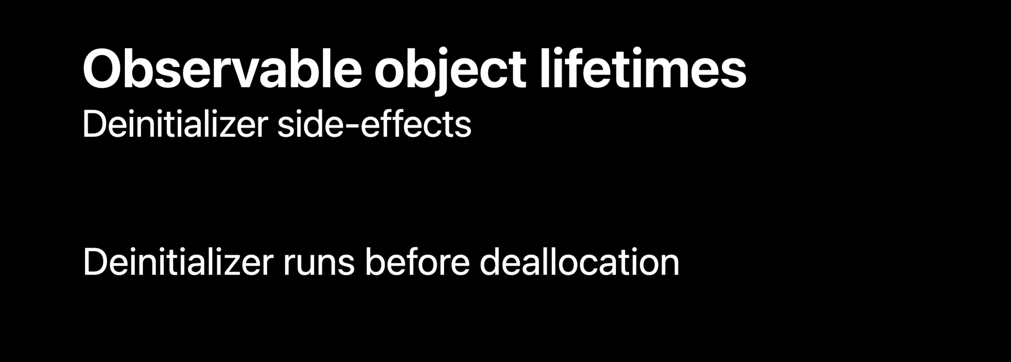 - 객체 수명을 관찰 가능하게 만드는 또 다른 언어 기능은 초기화 해제기 부작용(Deinitializer side-effects)임