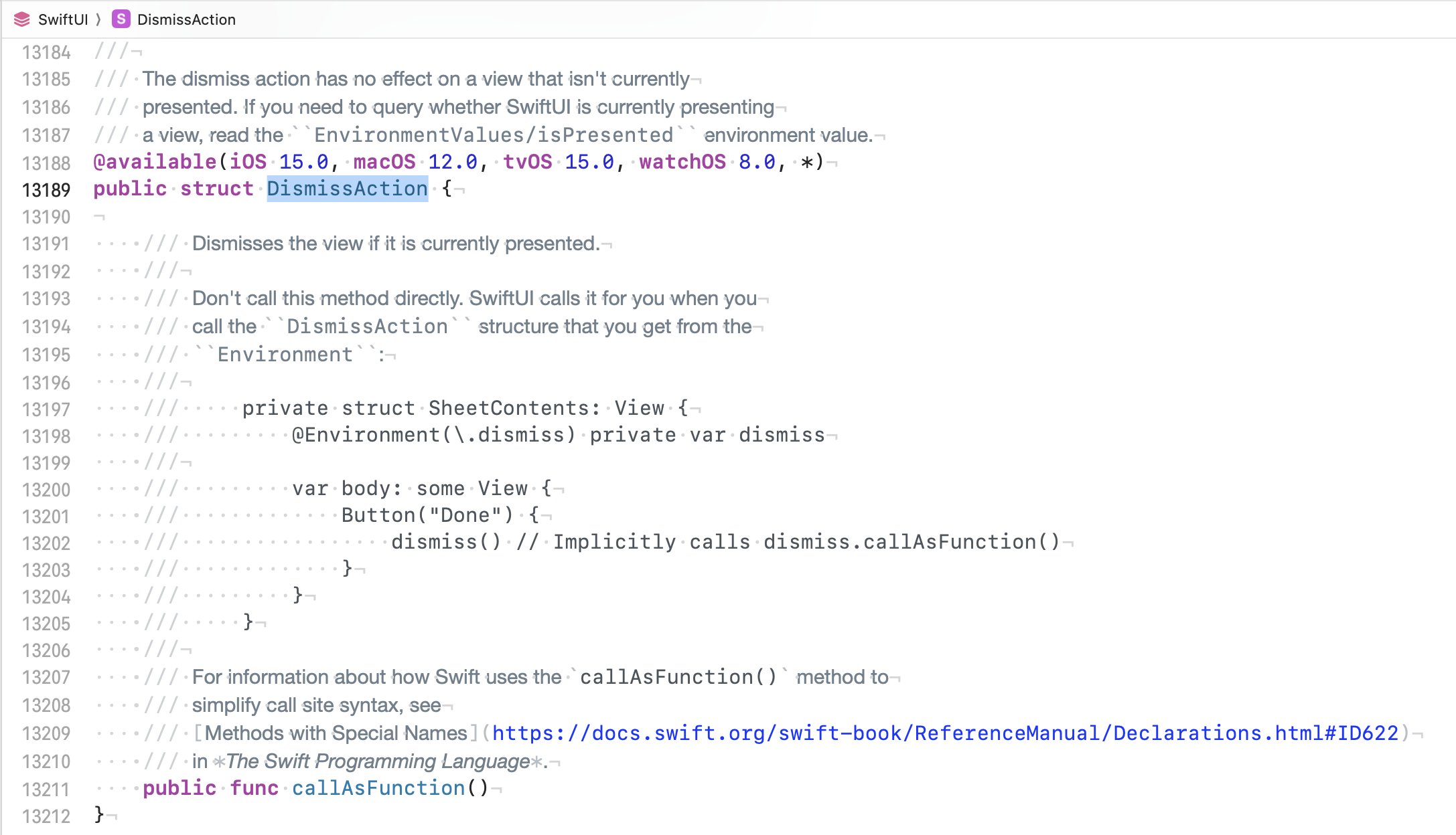 그리고 DismissAction은 callAsFunction을 정의했기 때문에 인스턴스를 함수처럼 호출할 수 있어 dismiss()로 사용함을 알 수 있었다.