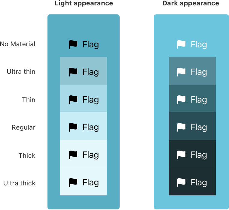 공통적으로 thin -> thick으로 갈 수록 더 불투명하고, appearance(라이트/다크모드를 뜻하는 것 같다)에 따라 밝고 어두움이 다름을 볼 수 있다.