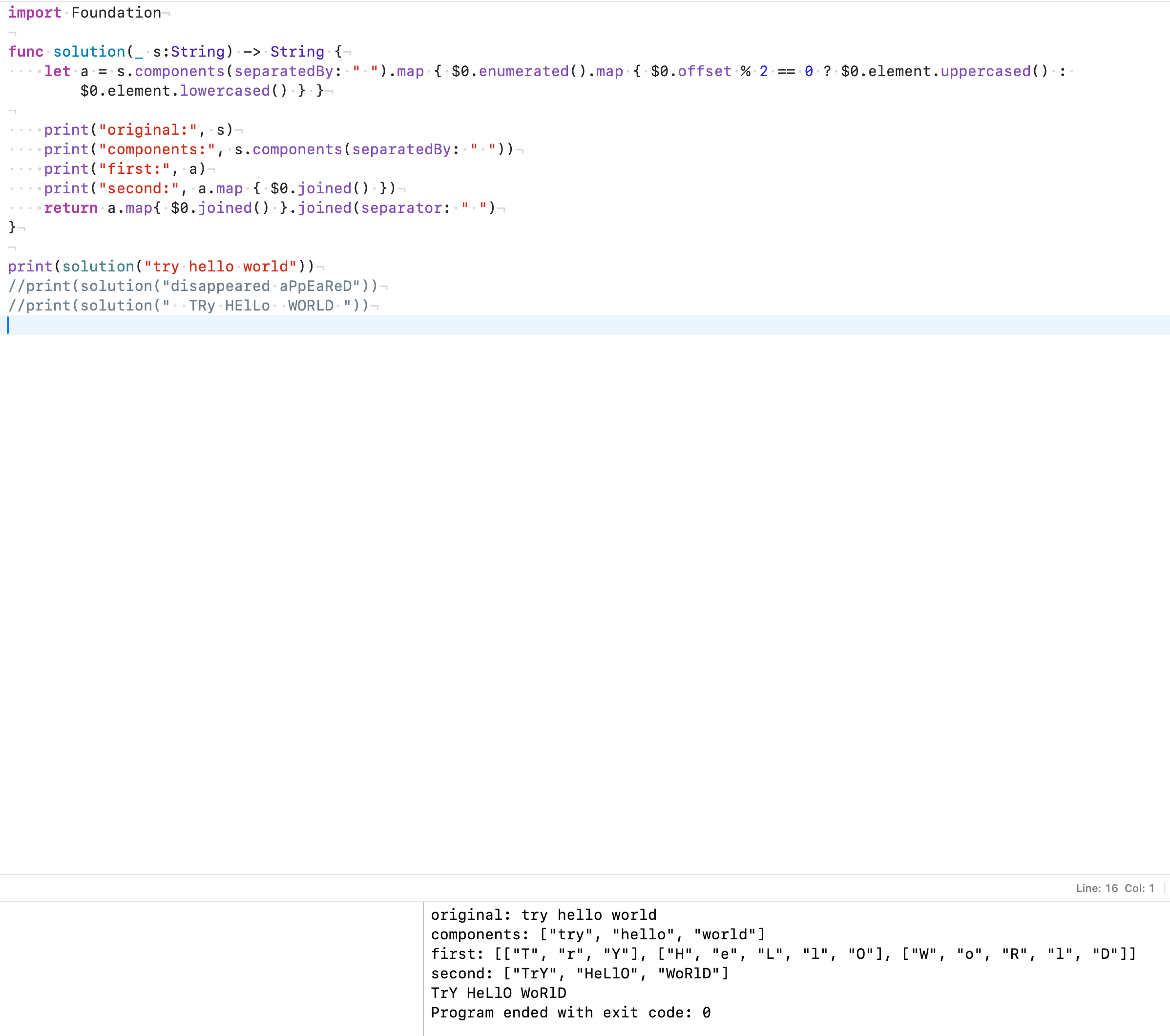 let a = s.components(separatedBy: " ").map { $0.enumerated().map { $0.offset % 2 == 0 ? $0.element.uppercased() : $0.element.lowercased() } }